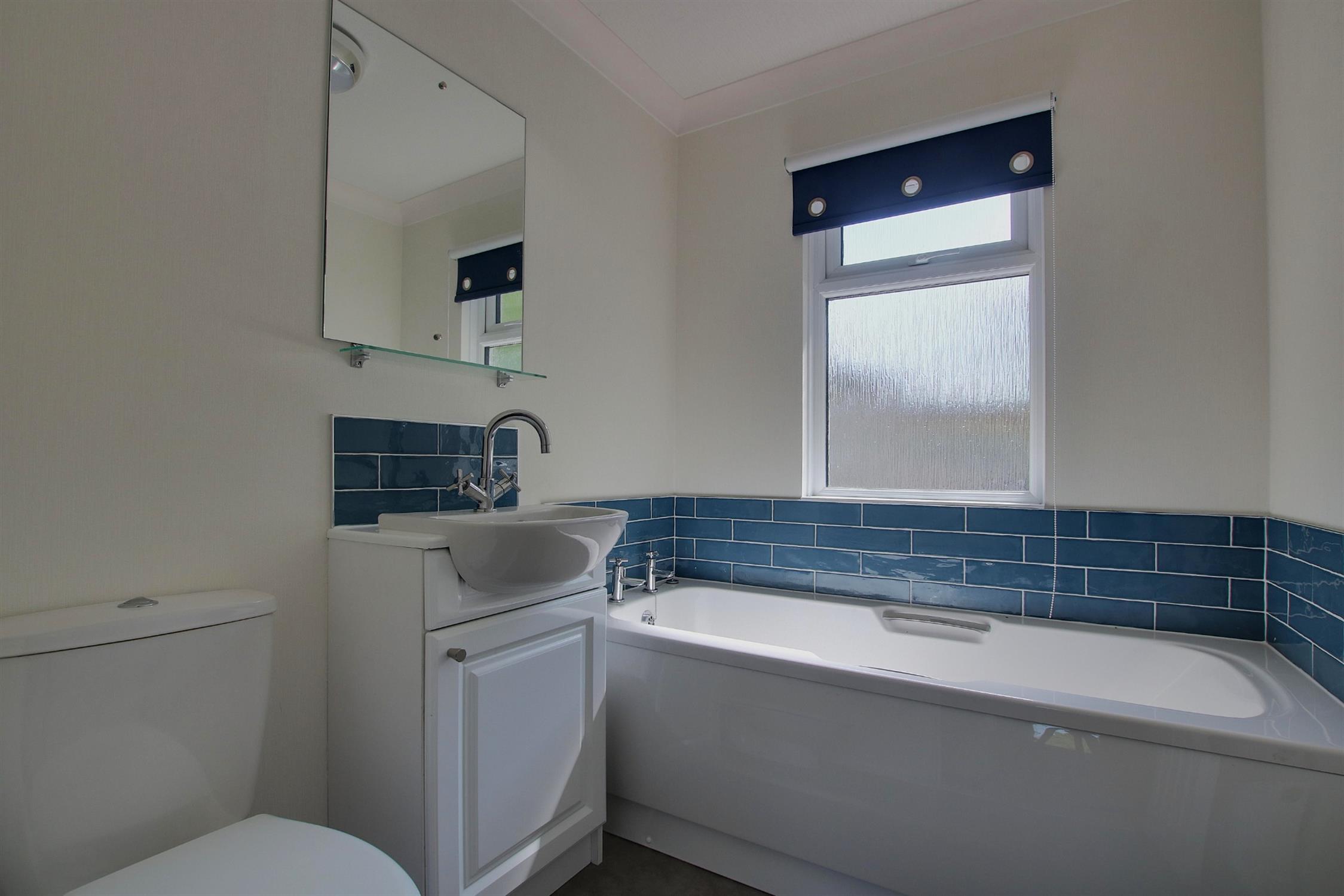Attractive modern suite comprising panel enclosed bath, wash basin with integrated storage cupboard under, WC, tiled splash backs, double-glazed window to the side.