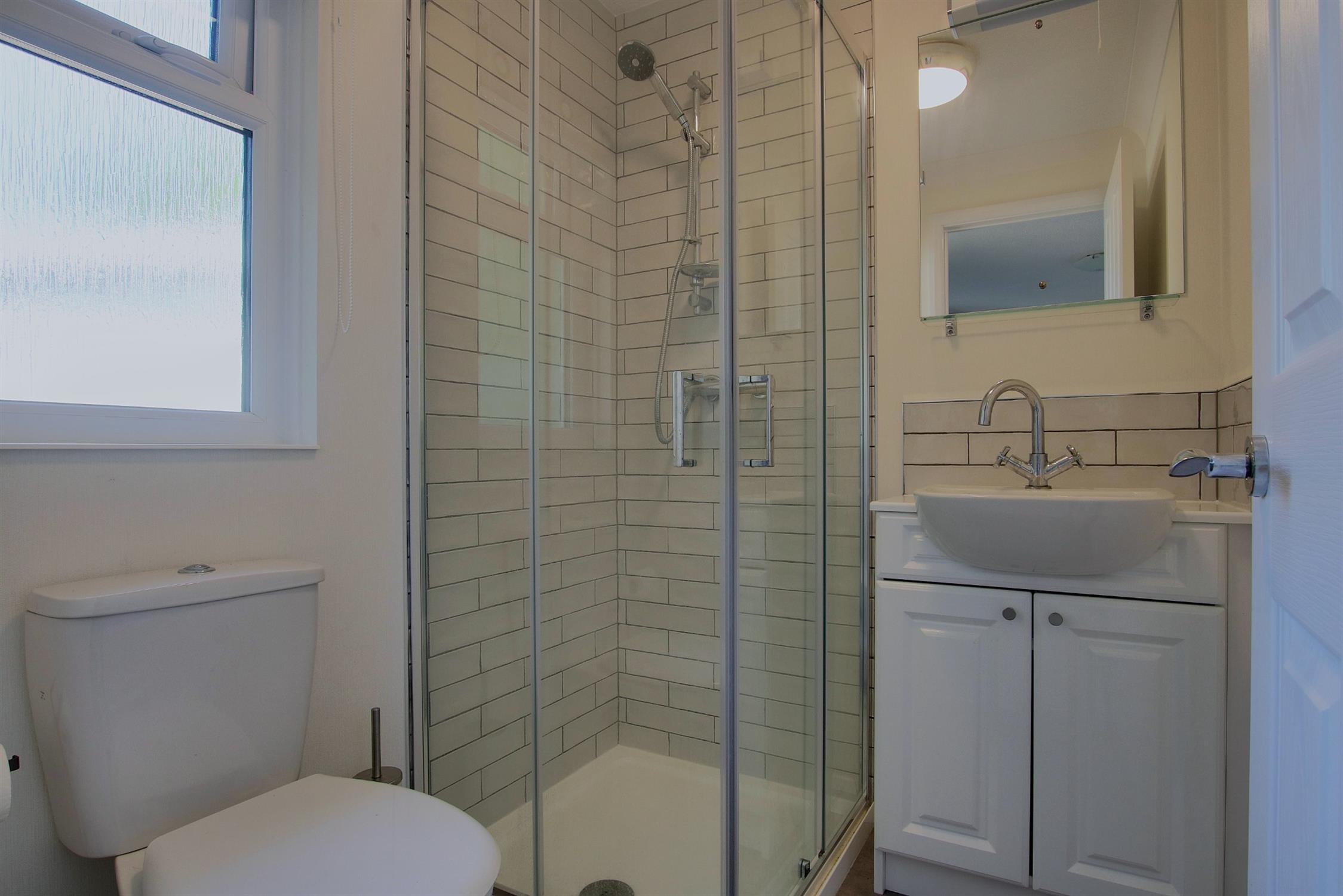 Modern suite comprising tiled shower cubicle, wash basin with integrated storage cupboard under, WC, double-glazed window to the side.