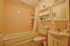 BATHROOM – Suite comprising; a panel bath with mixer tap and shower attachment, low-level W.C. and pedestal wash hand basin with vanity unit, and radiator.