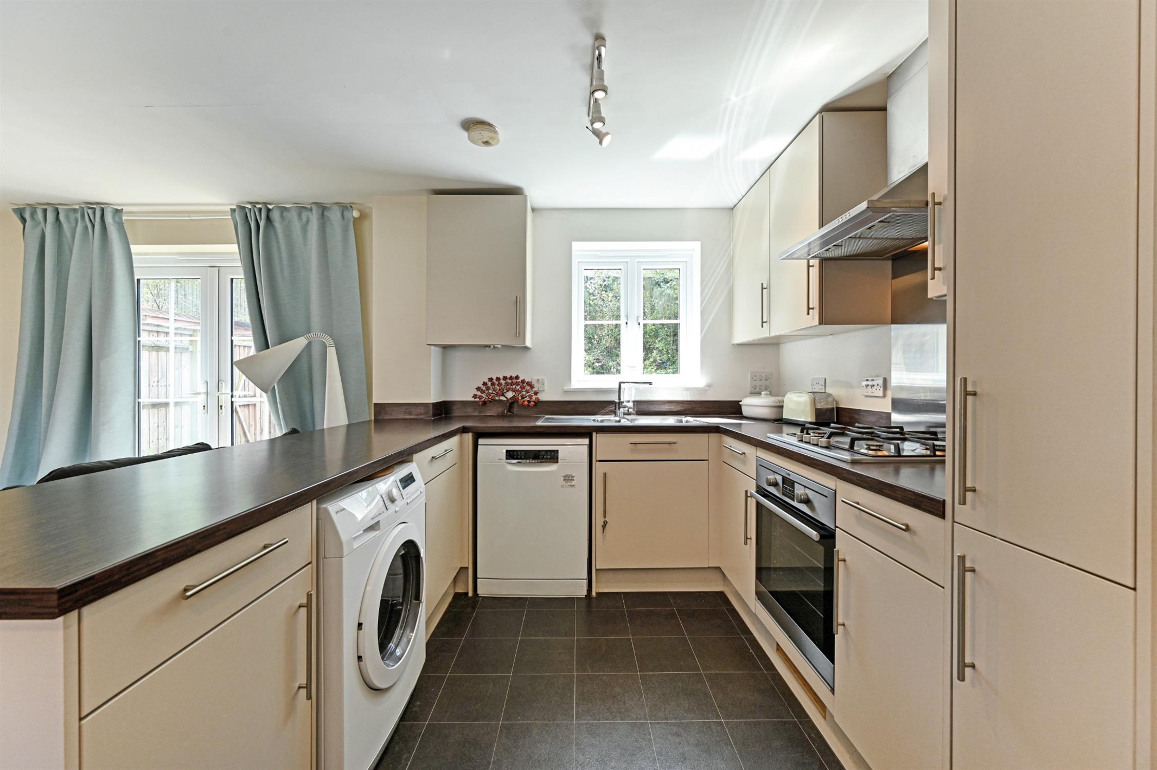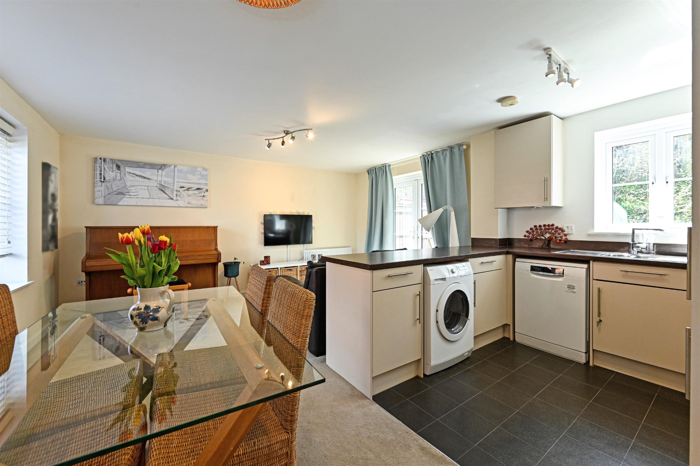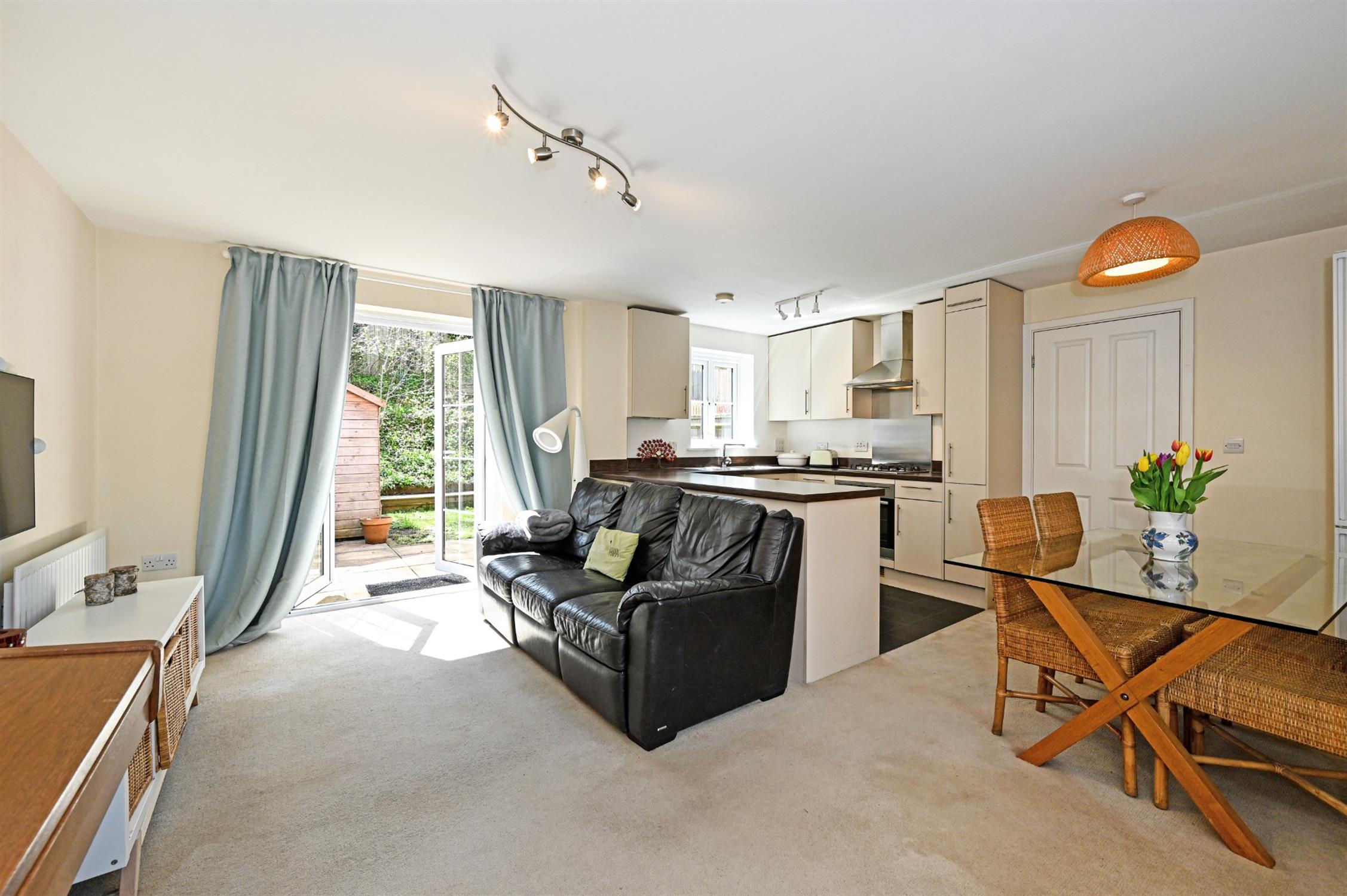 Upon entry through the covered front door, there is an entrance hall which leads to all ground floor accommodation and has stairs rising to the first floor. The kitchen/living room is open-plan and is a warm social space with plenty of room for both lounge and dining furniture. The kitchen is fitted with a range of eye and low-level units with a peninsula island. It is fitted with a range of integrated appliances including gas rings, oven, fridge/freezer, and there is further space for whitegoods. French doors lead from the living room to the garden and allow ample light into the dual aspect space. Finishing off the ground floor is a WC for guests and built-in storage under the stairs.