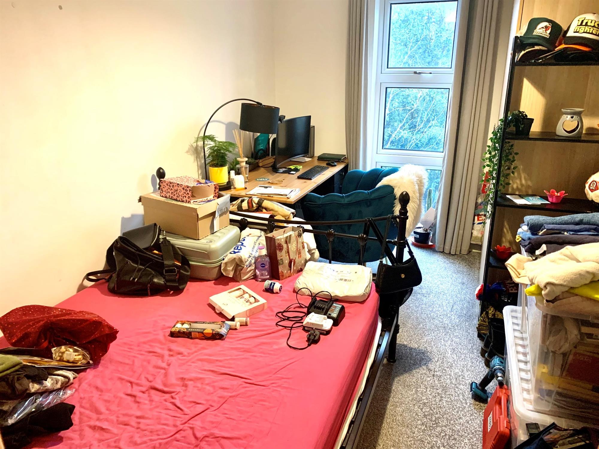 The room is carpeted with window to front and has door to ensuite. Furniture consists of: Metal framed double bed with mattress, 2 bedside units and chest of drawers.