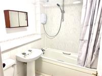 BATHROOM: White suite bathroom with shower over bath, sink and toilet.