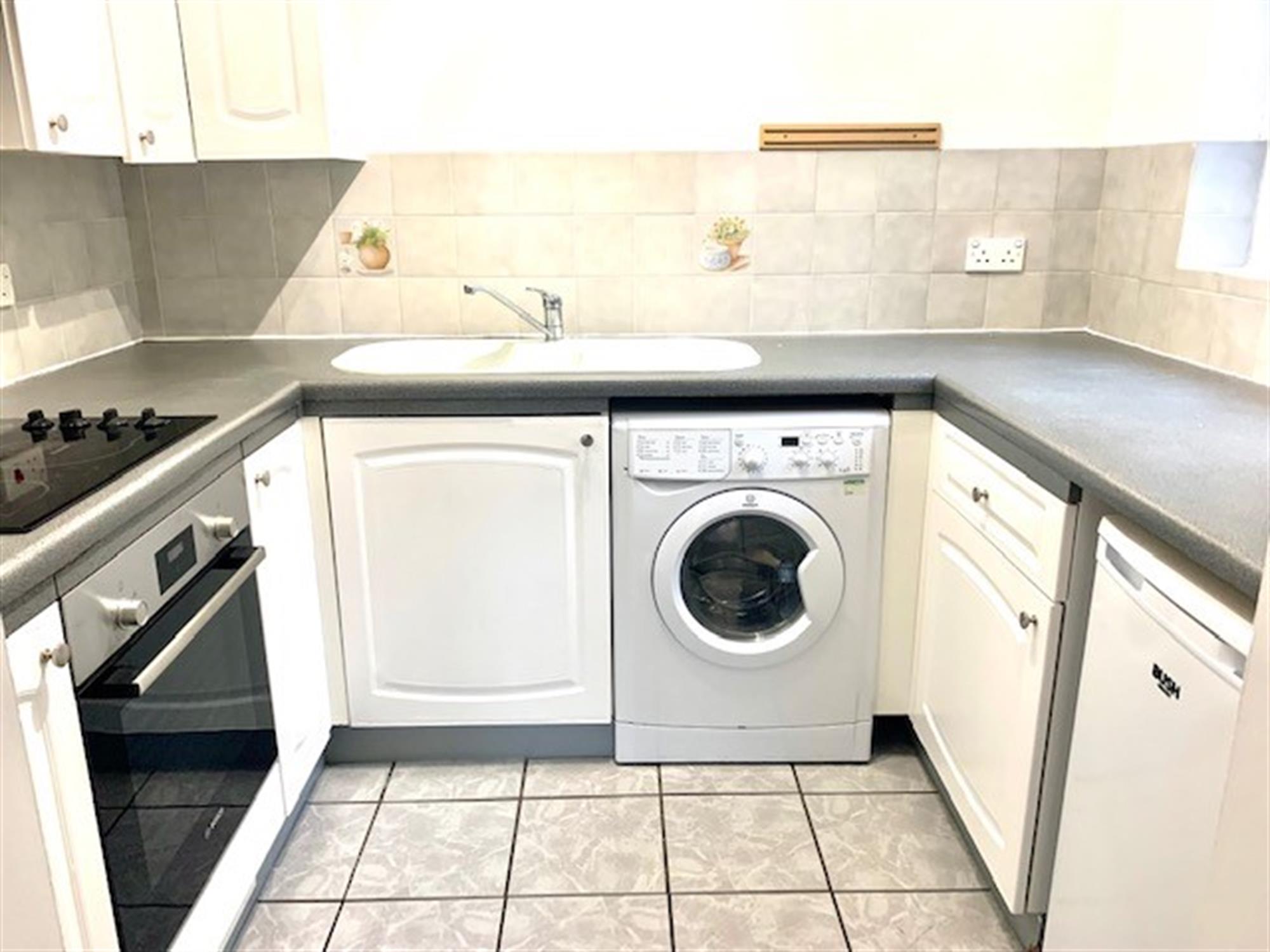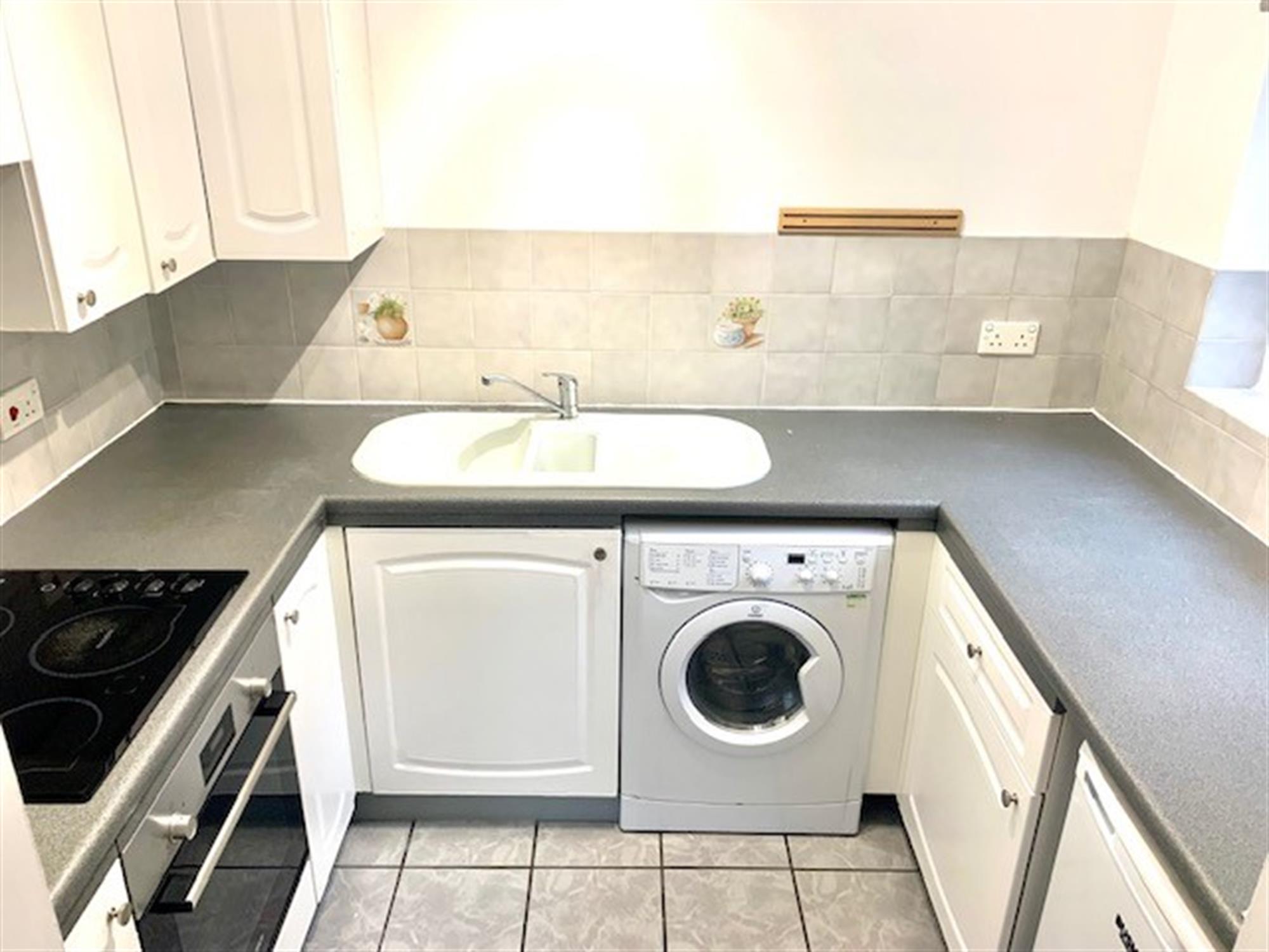 KITCHEN: Various wall and base units with appliances consisting of washing machine, fridge/freezer, electric hob and electric oven. Window to side.