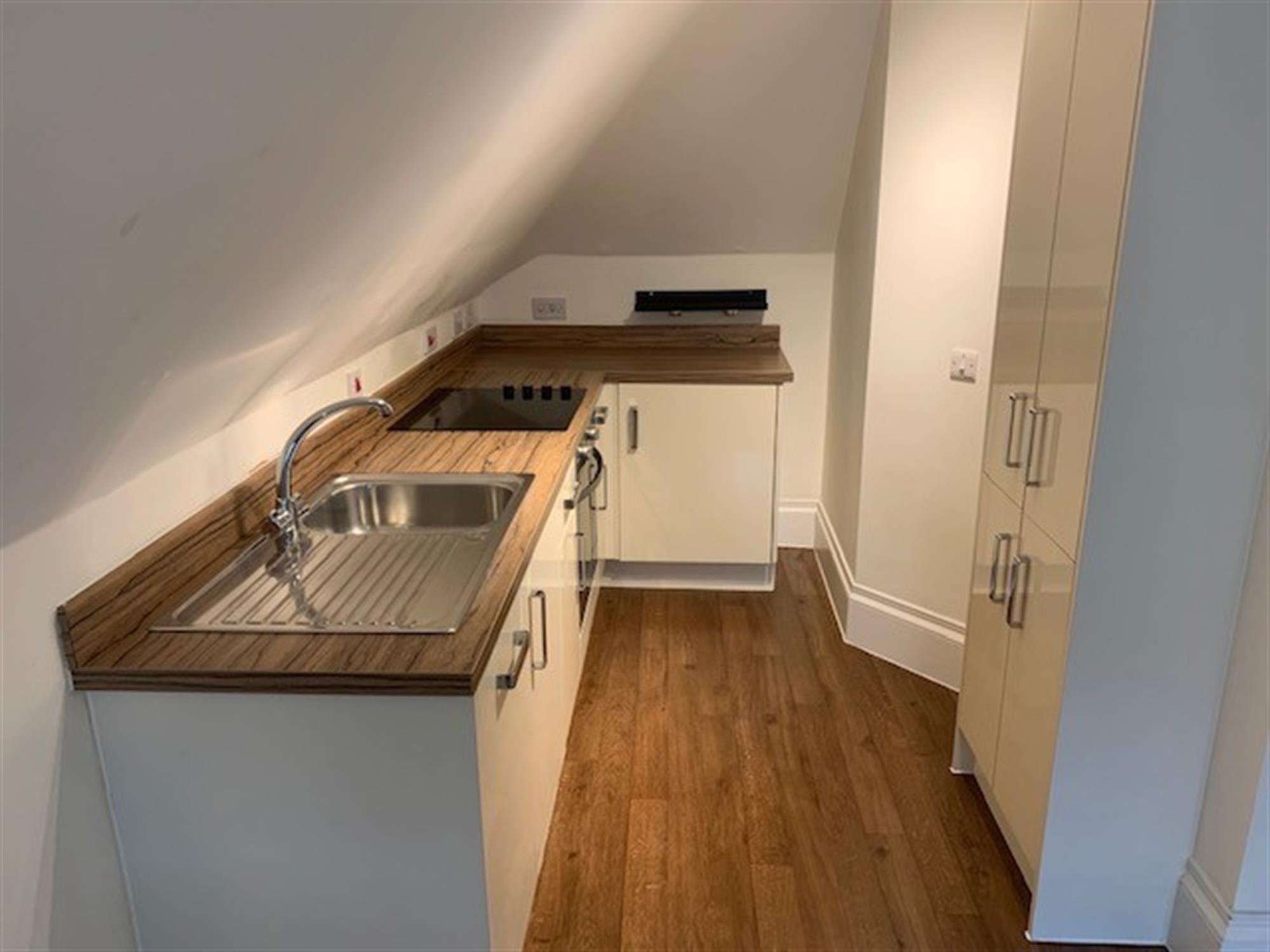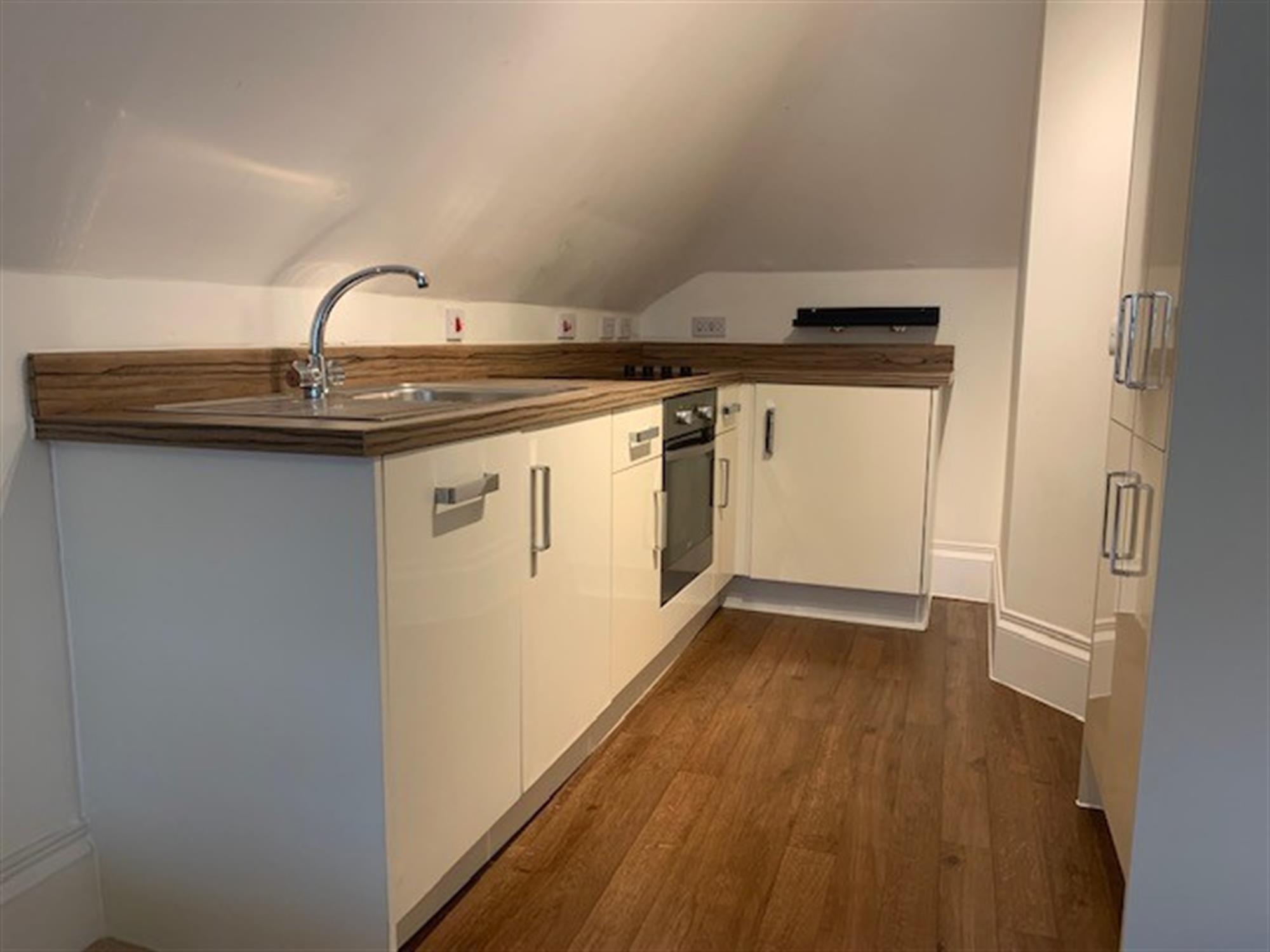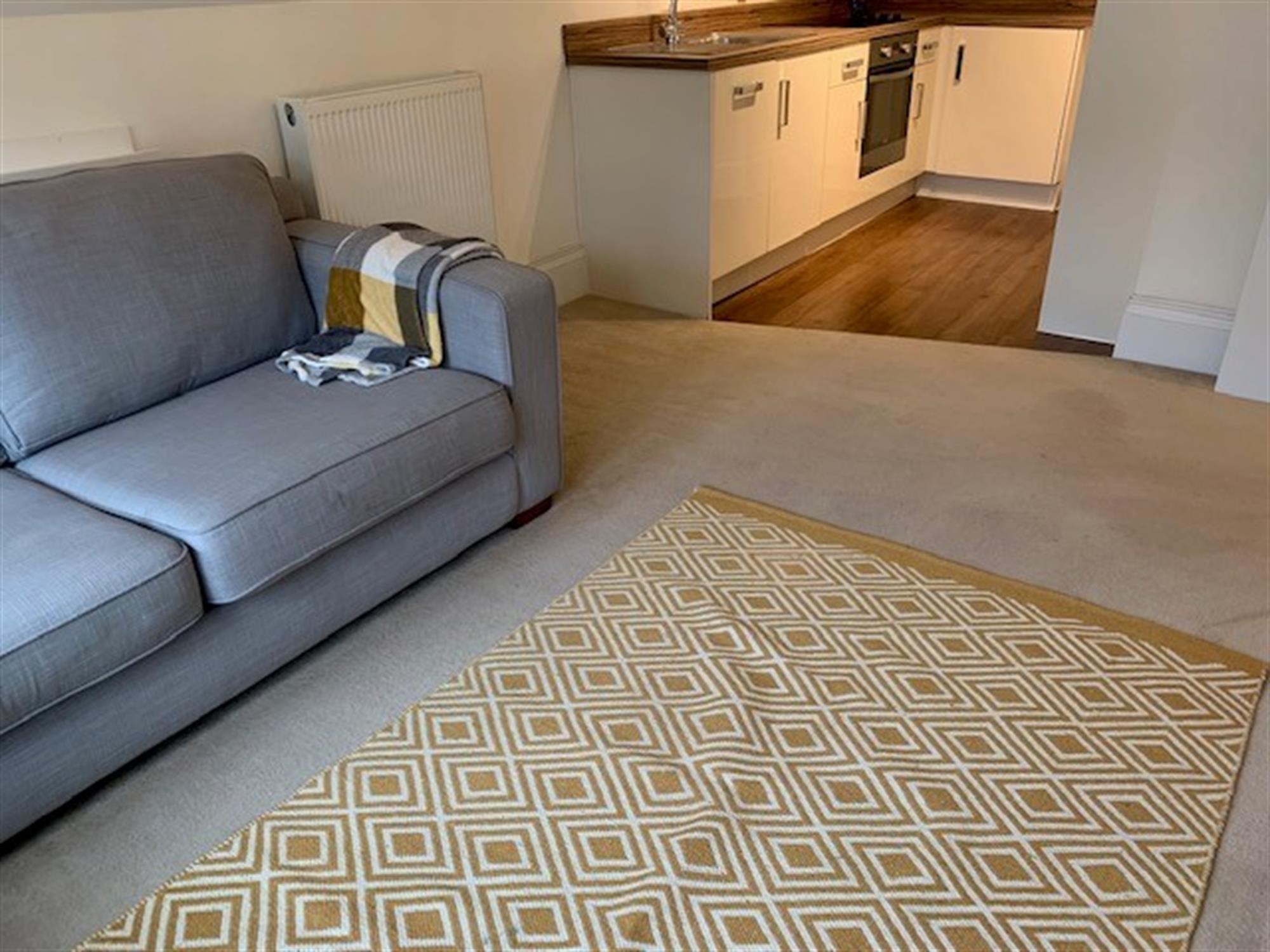 Modern Open Plan Kitchen Living Room with mixture of Carpet flooring and Vinyl. Cream gloss kitchen units with wood effect worktop over and splash back. Tall Standing Fitted Cupboard. Integrated Slimline Dishwasher and Fridge with small freezer compartment. Electric Oven and Hob. Extractor Fan. Wooden framed double glazed windows to side aspect. Included is a sofa and two wooden shelving units. Furniture includes 2 seater sofa and shelf unit.