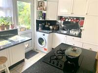 White gloss wall and base units which incorporate breakfast bar and appliances consisting of electric hob, integral fridge and freezer. There is a space for the washing machine. Door and window to garden.