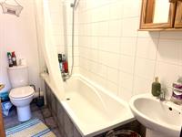 White suite with bath with shower over, toilet and sink. Cupboard off housing water tank.