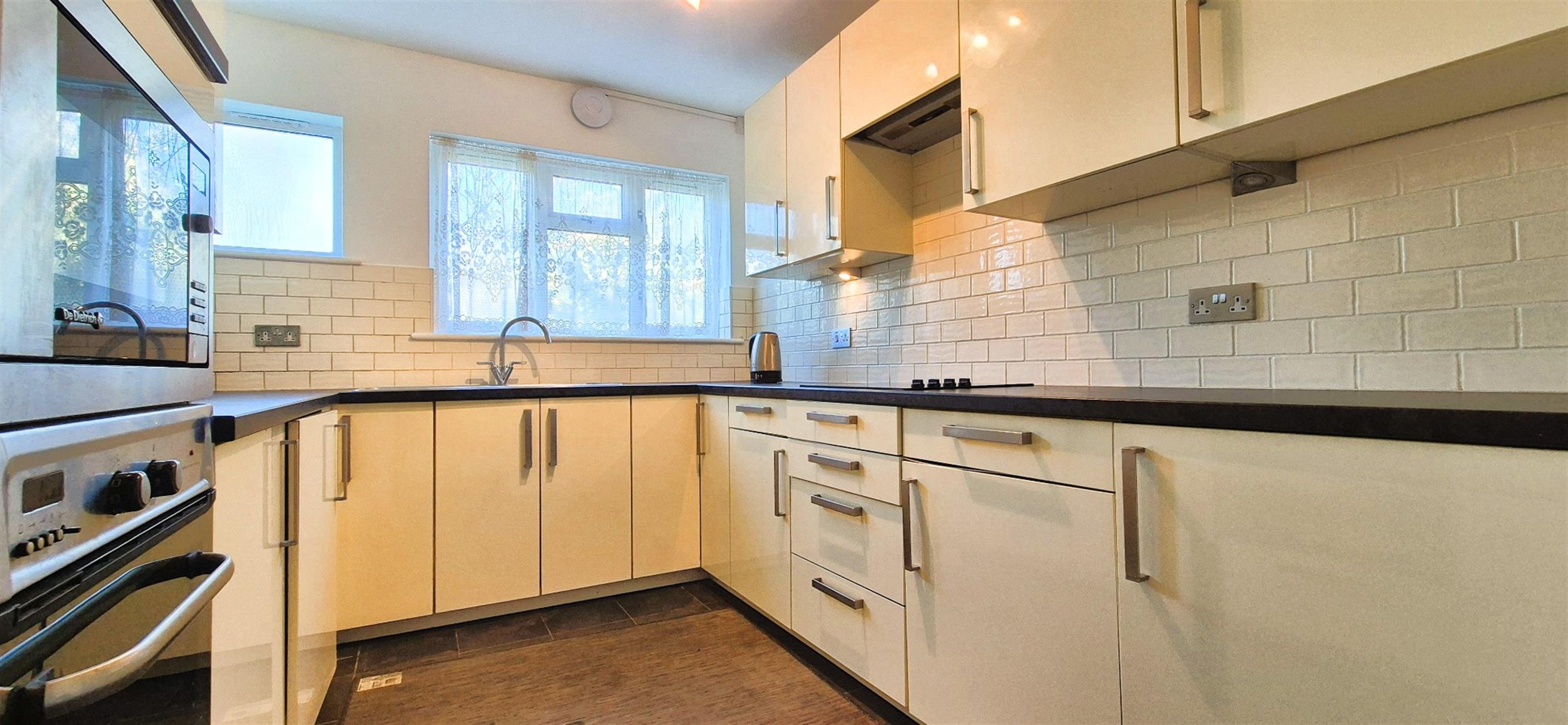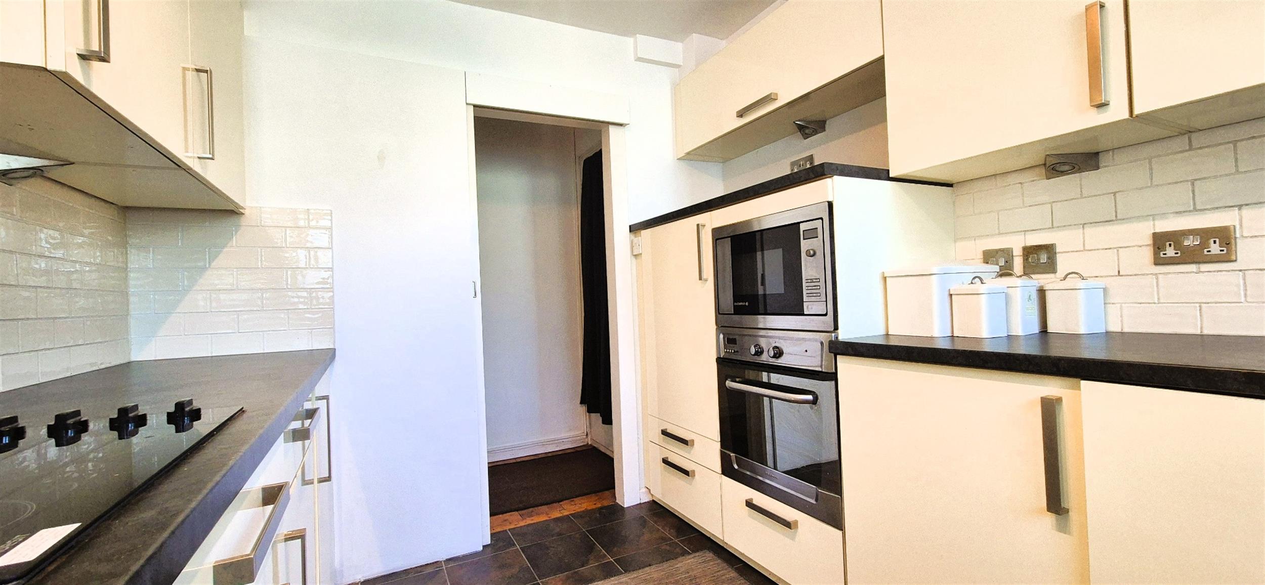 Range of modern wall and base units. The appliances consist of electric hob, electric oven, integral fridge, integral freezer, integral washing machine and integral microwave. Window facing rear.