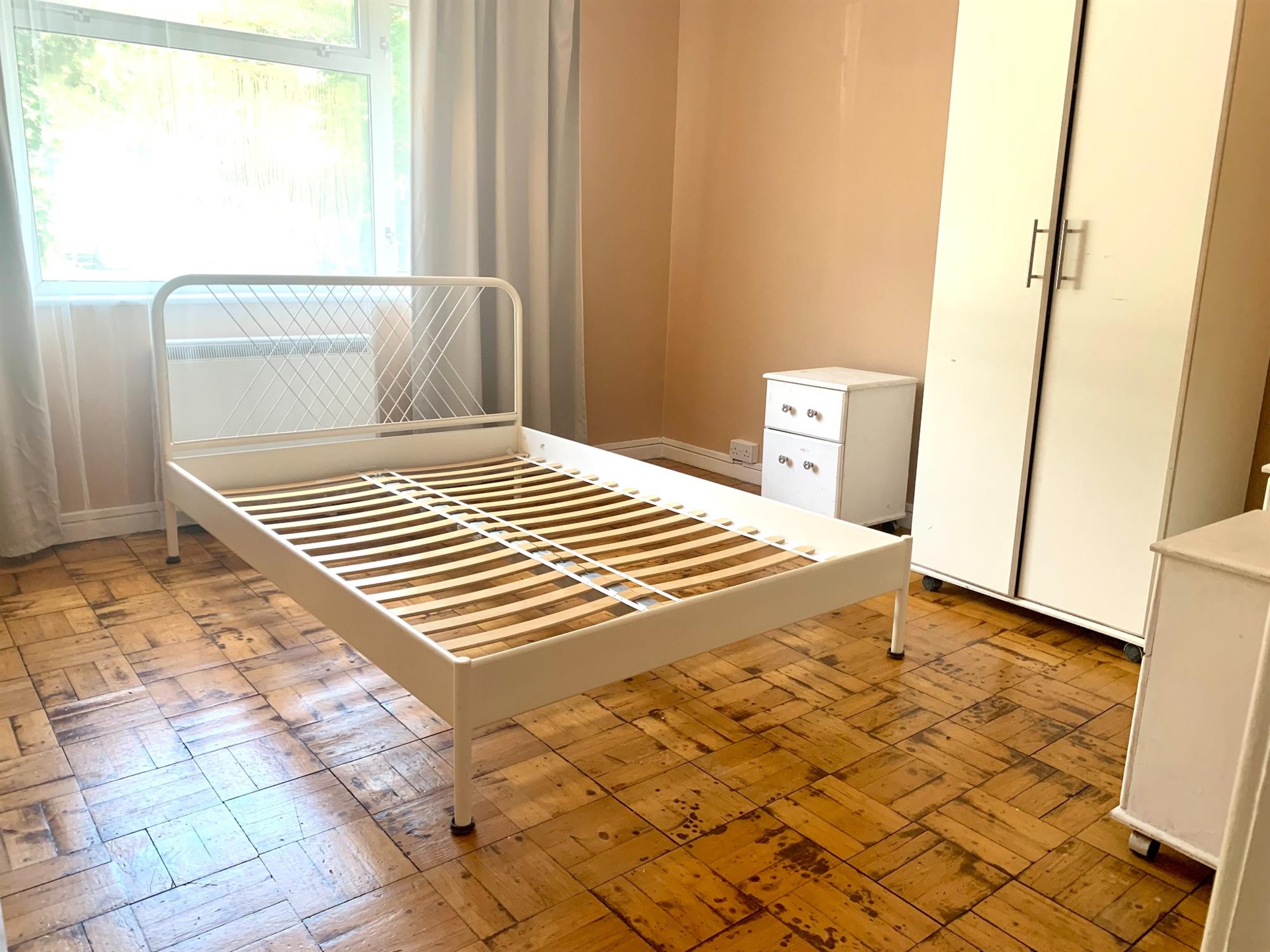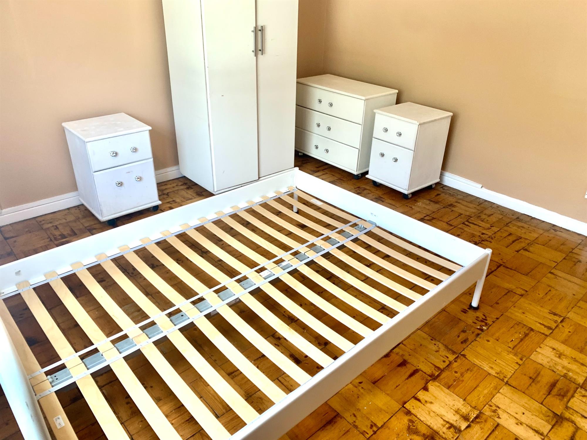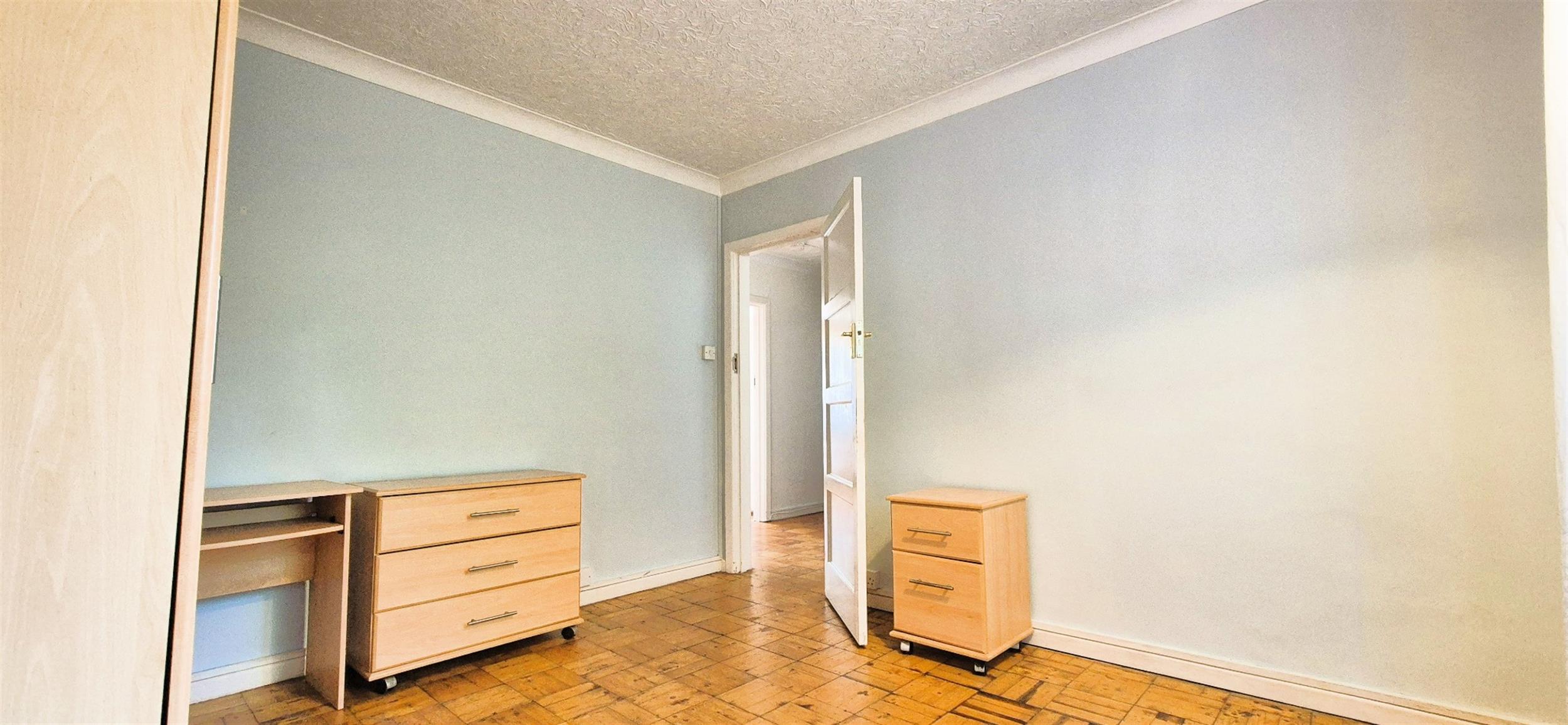Parquet flooring. Window to front. Furniture consists of wardrobe, double bed base only and drawers.