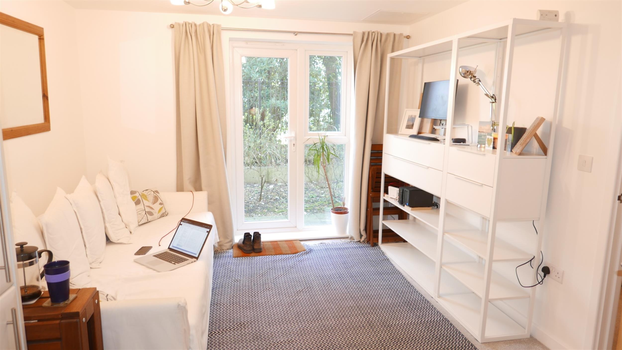 Carpet flooring with window to rear. Furnishings consist of: Sofa bed, fold up table and 2 chairs and white shelving unit.