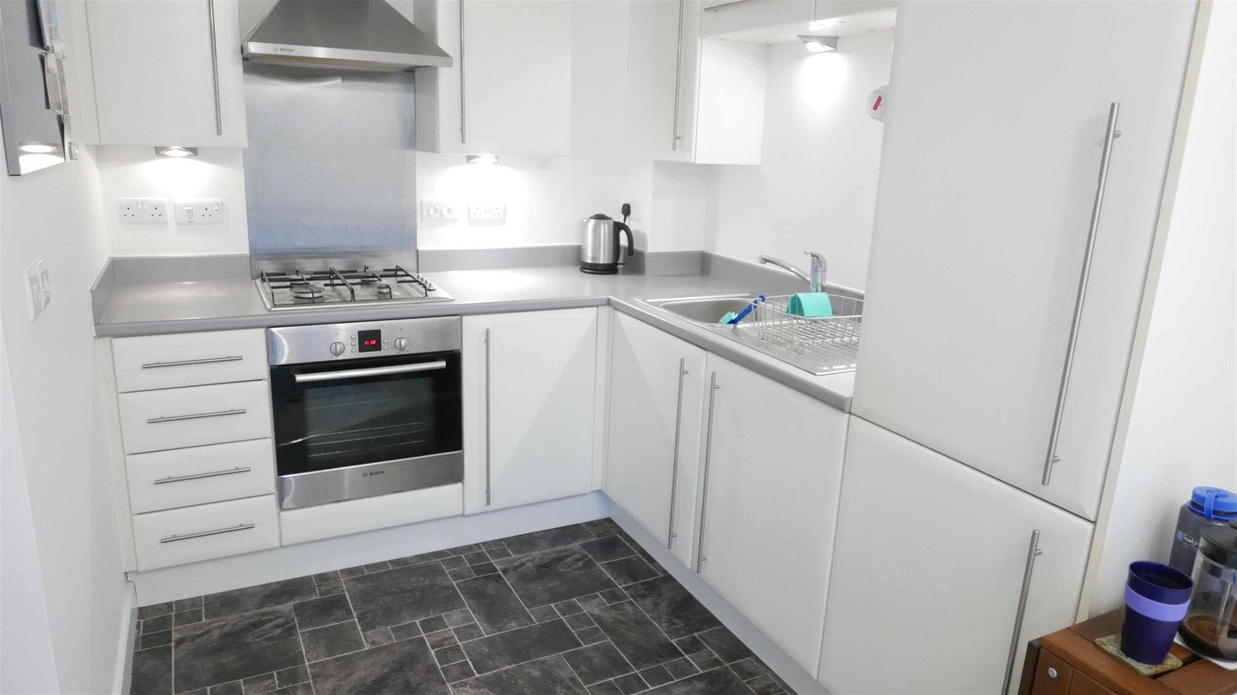 Appliances include gas hob, electric oven, integrated fridge/freezer.
