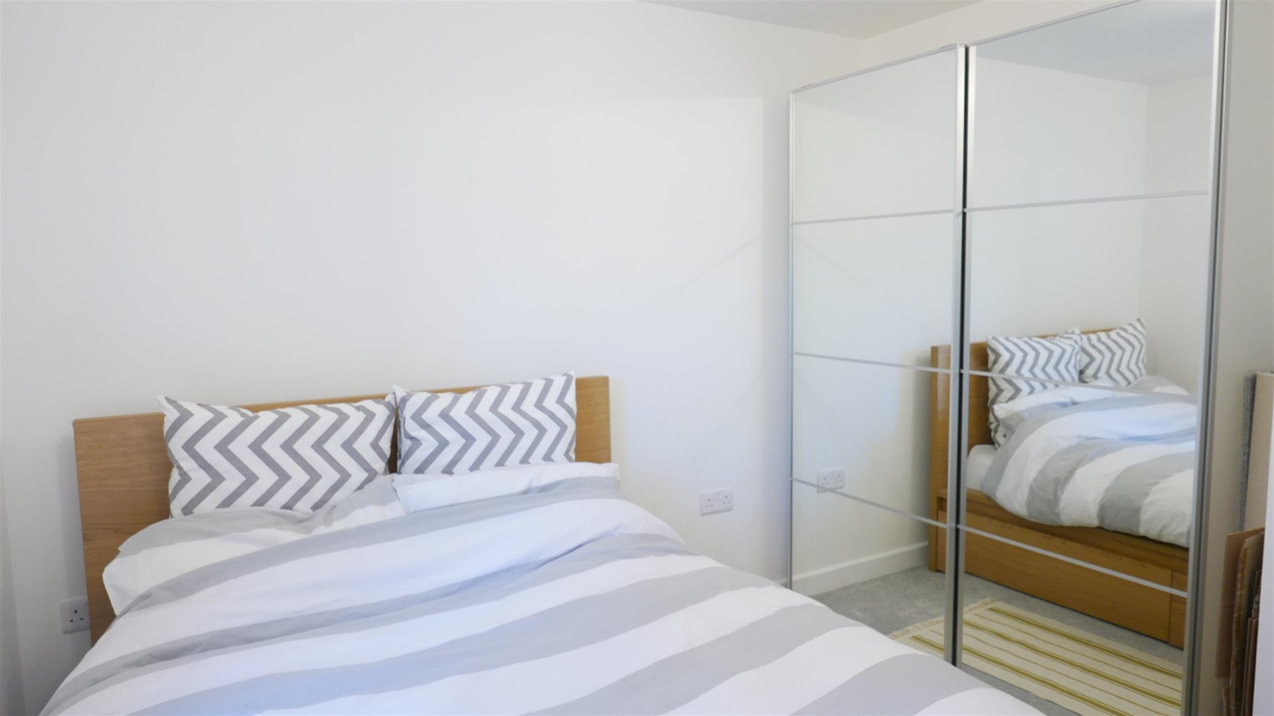 Double bedroom with window to rear with carpeted flooring. Furnishings consist of: Double bed with drawers and mattress and white mirrored wardrobe.