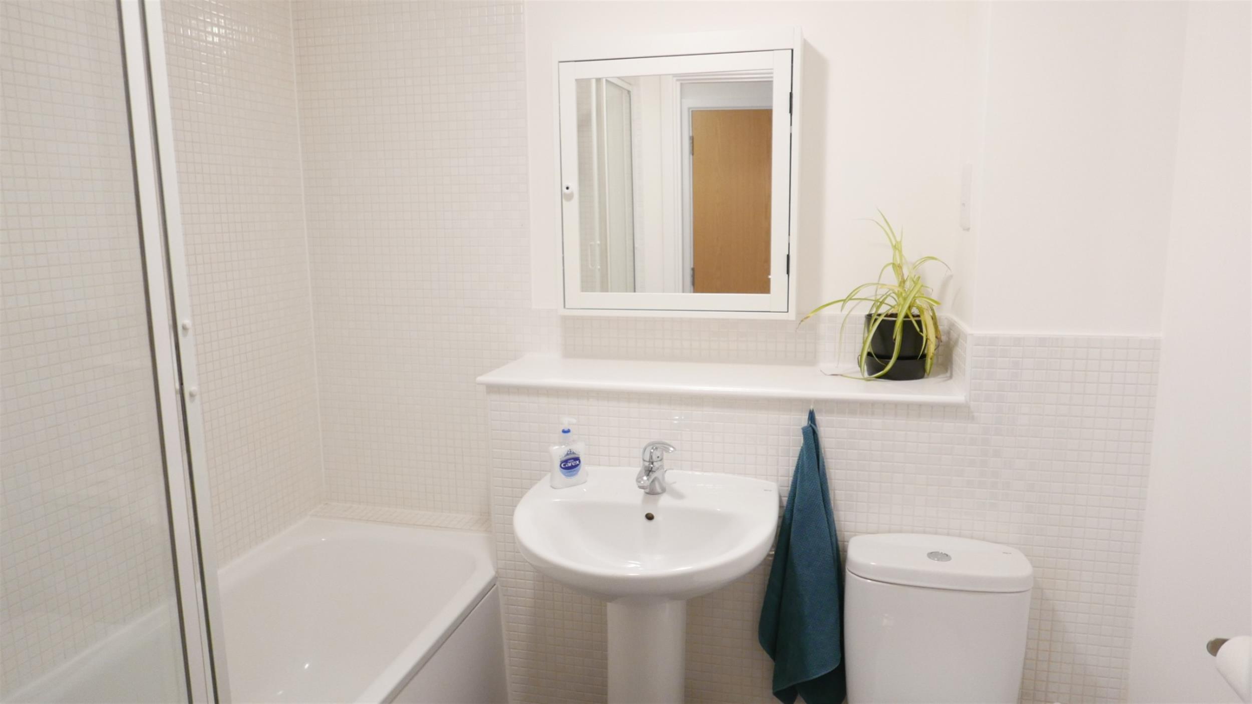 Modern suite with shower attachment over bath, hand basin and WC.
