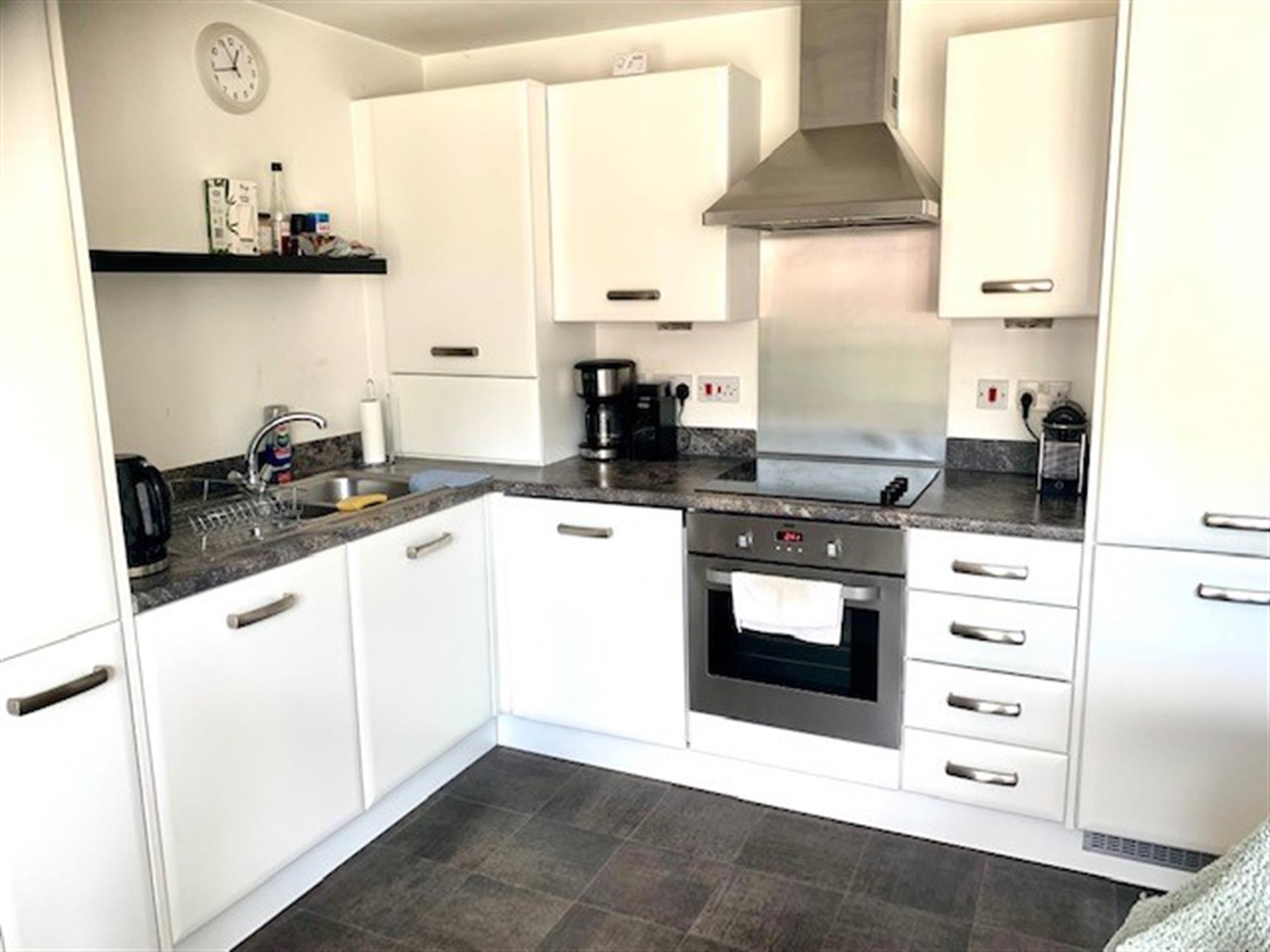 KITCHEN - Range of wall and base units with integral washer/dryer, integral fridge/freezer, built in oven with four ring electric hob rings.
