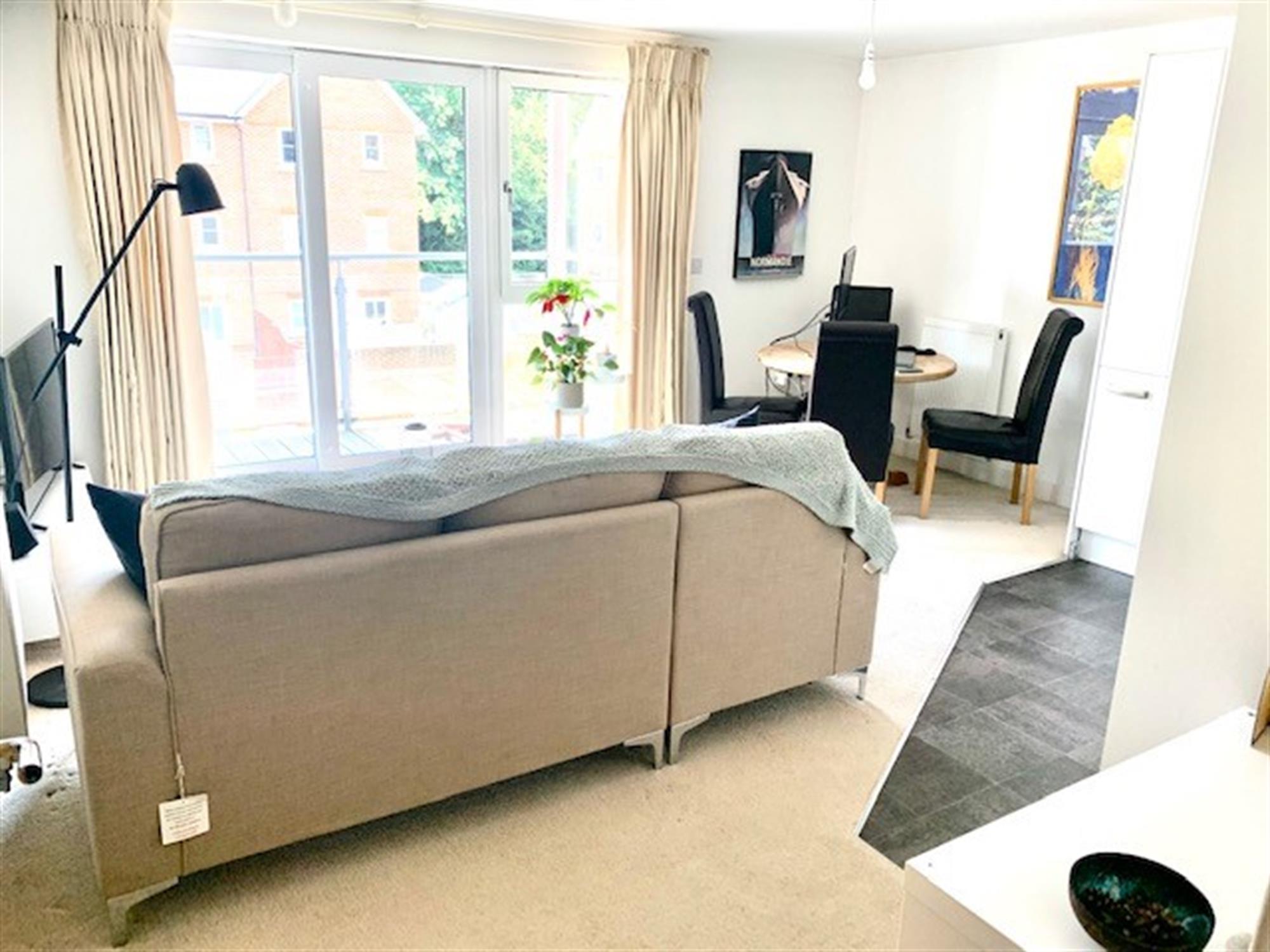 LOUNGE - Open plan to kitchen with carpet and doors leading to balcony.