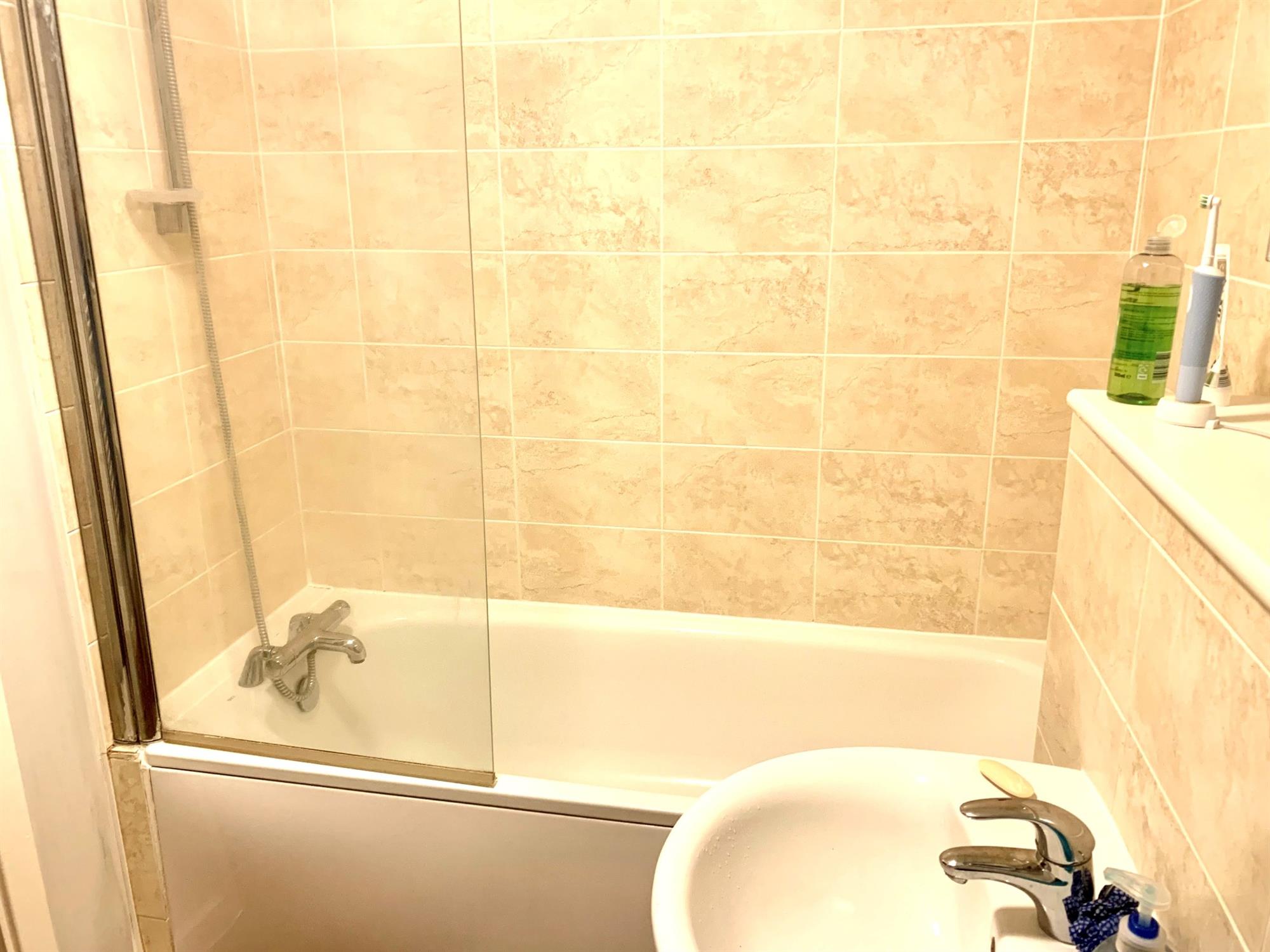 Modern suite with shower attachment over bath, hand basin and WC.