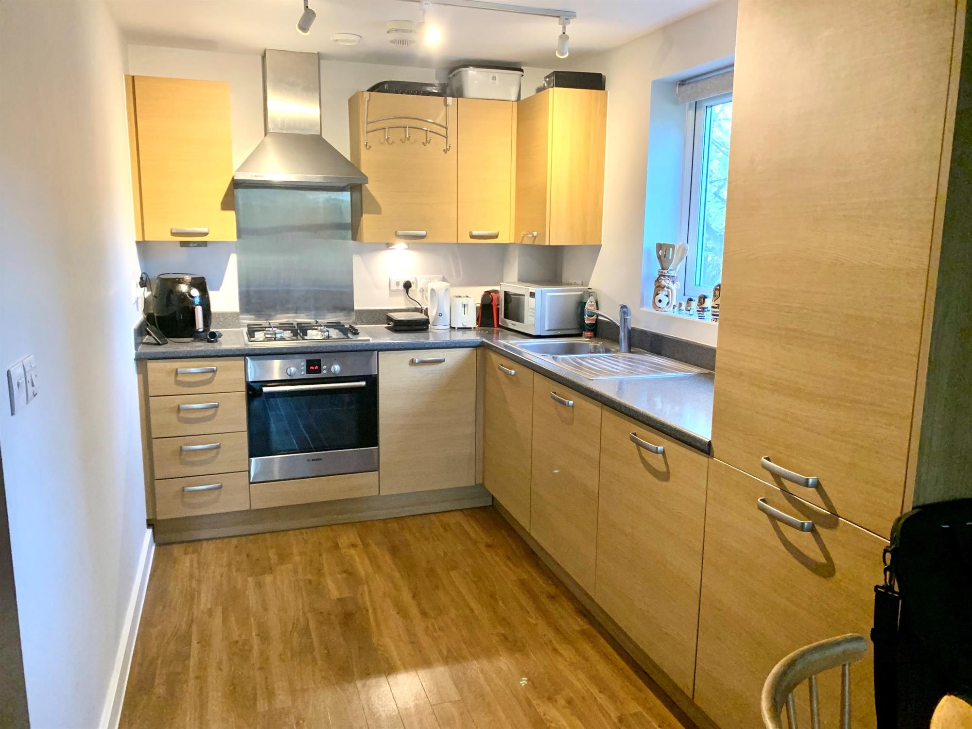 Modern kitchen with range of wall and base units. Appliances include gas hob, electric oven, integrated fridgefreezer. Window to side.