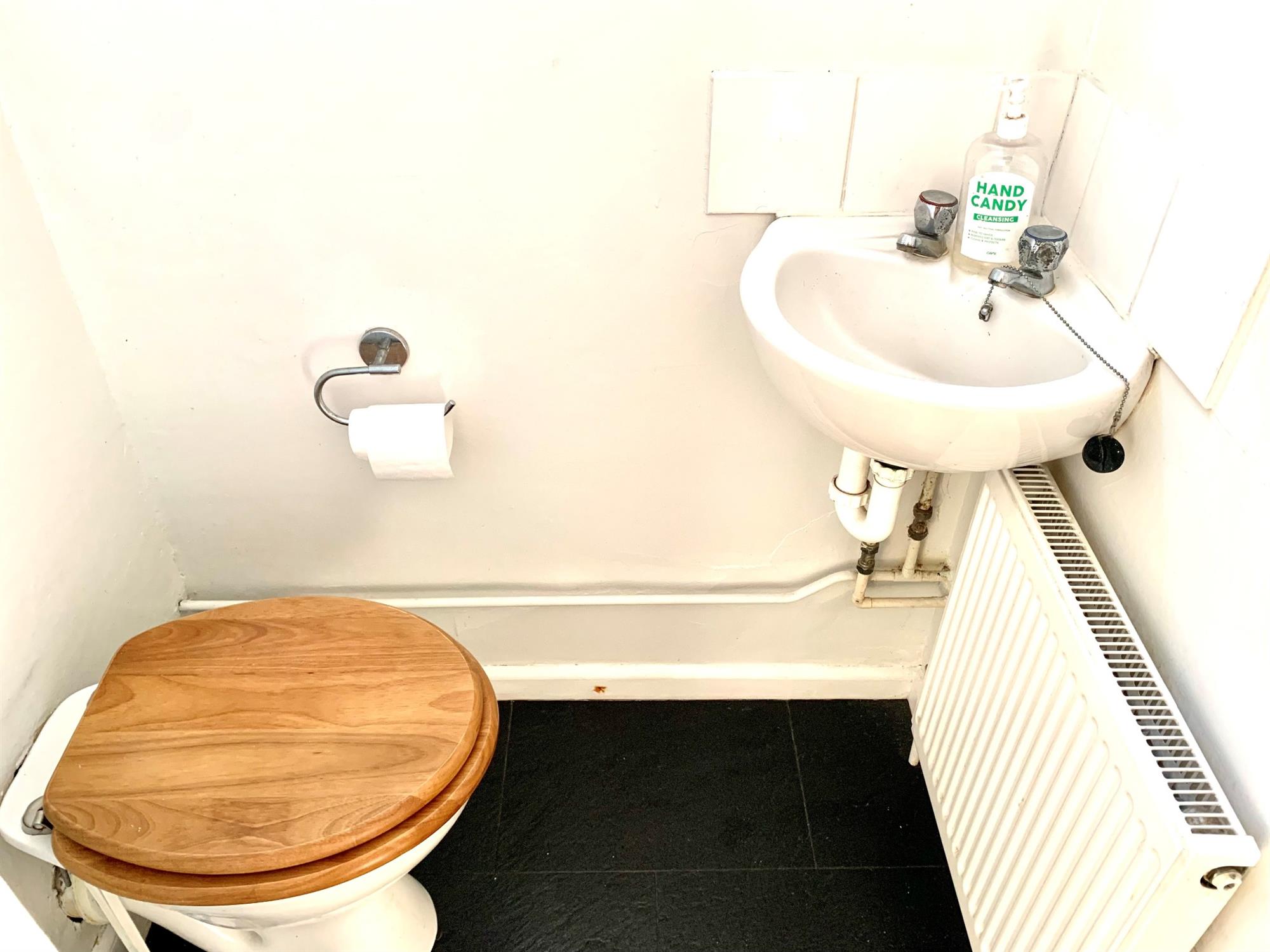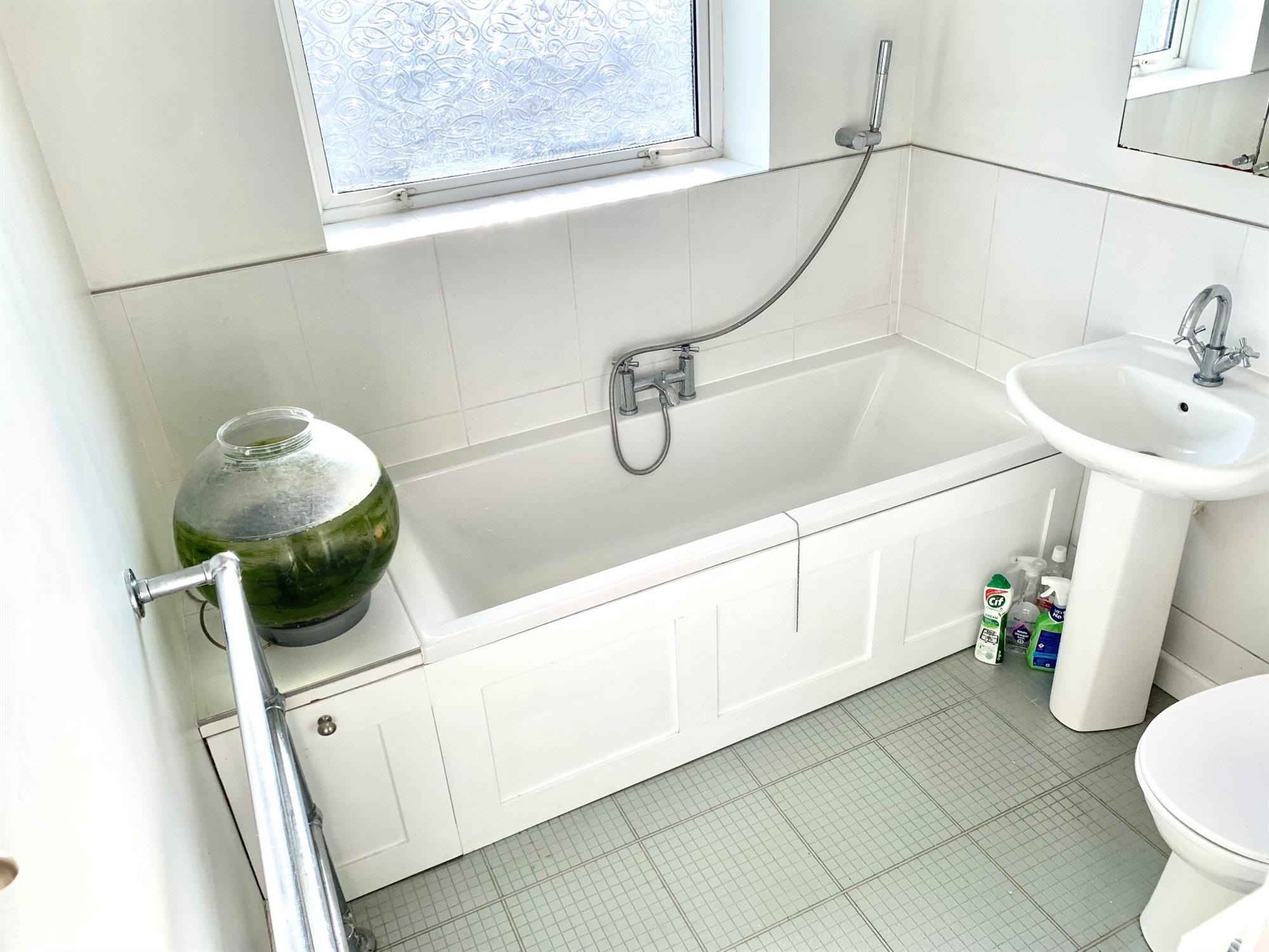 FAMILY BATHROOM - 3 piece white suite with sink, toilet and bath with hand held shower. Window to front.