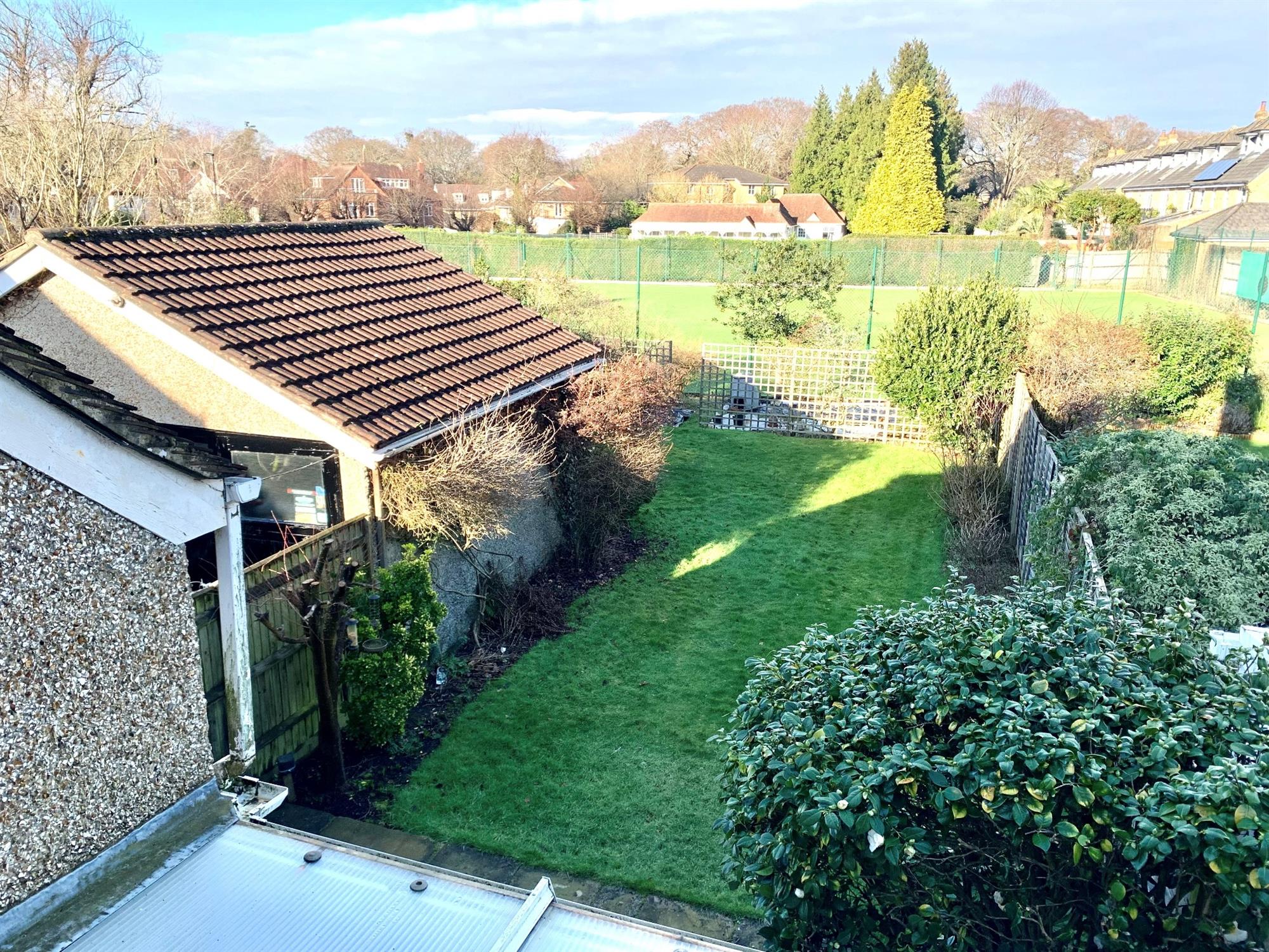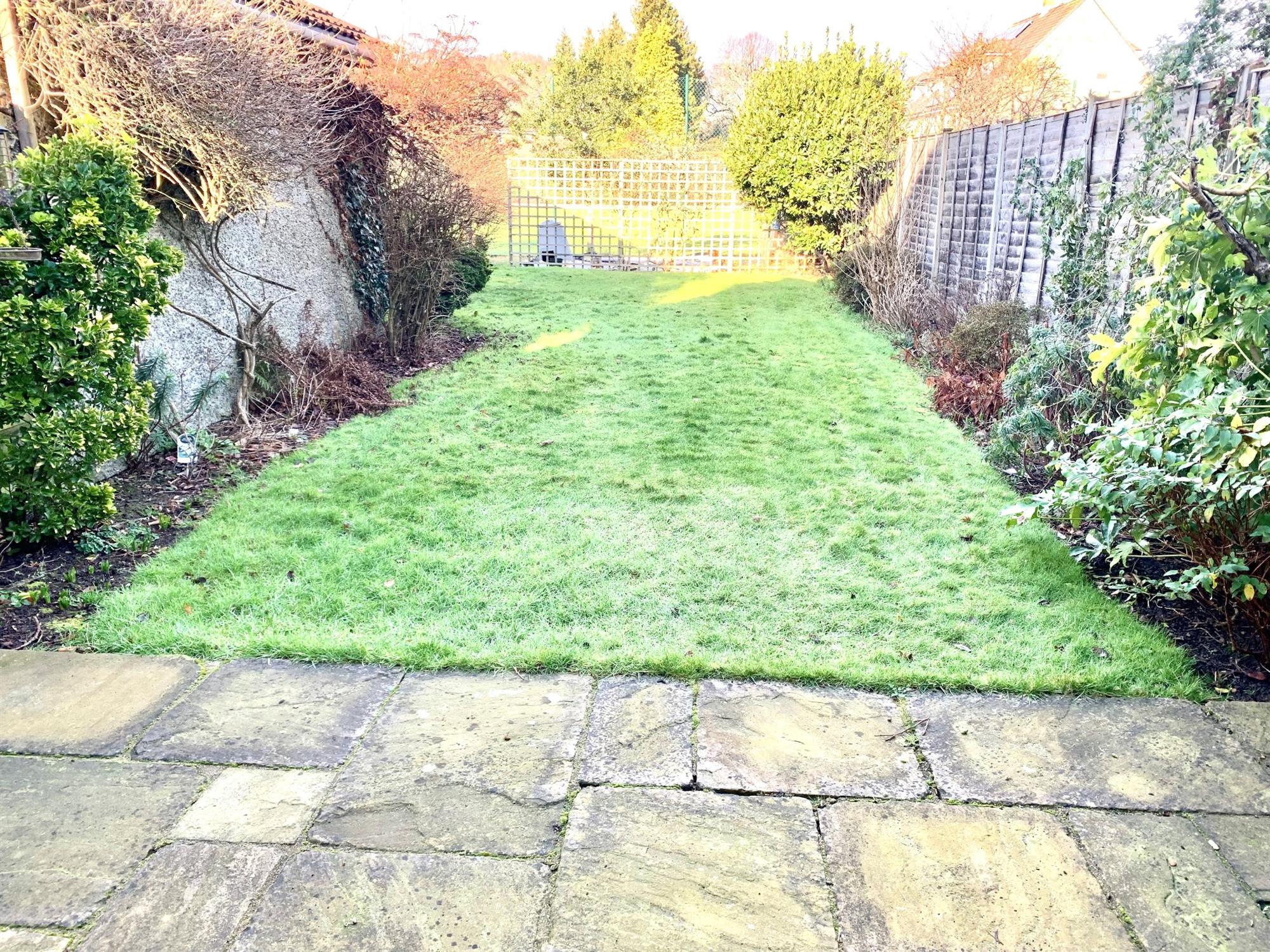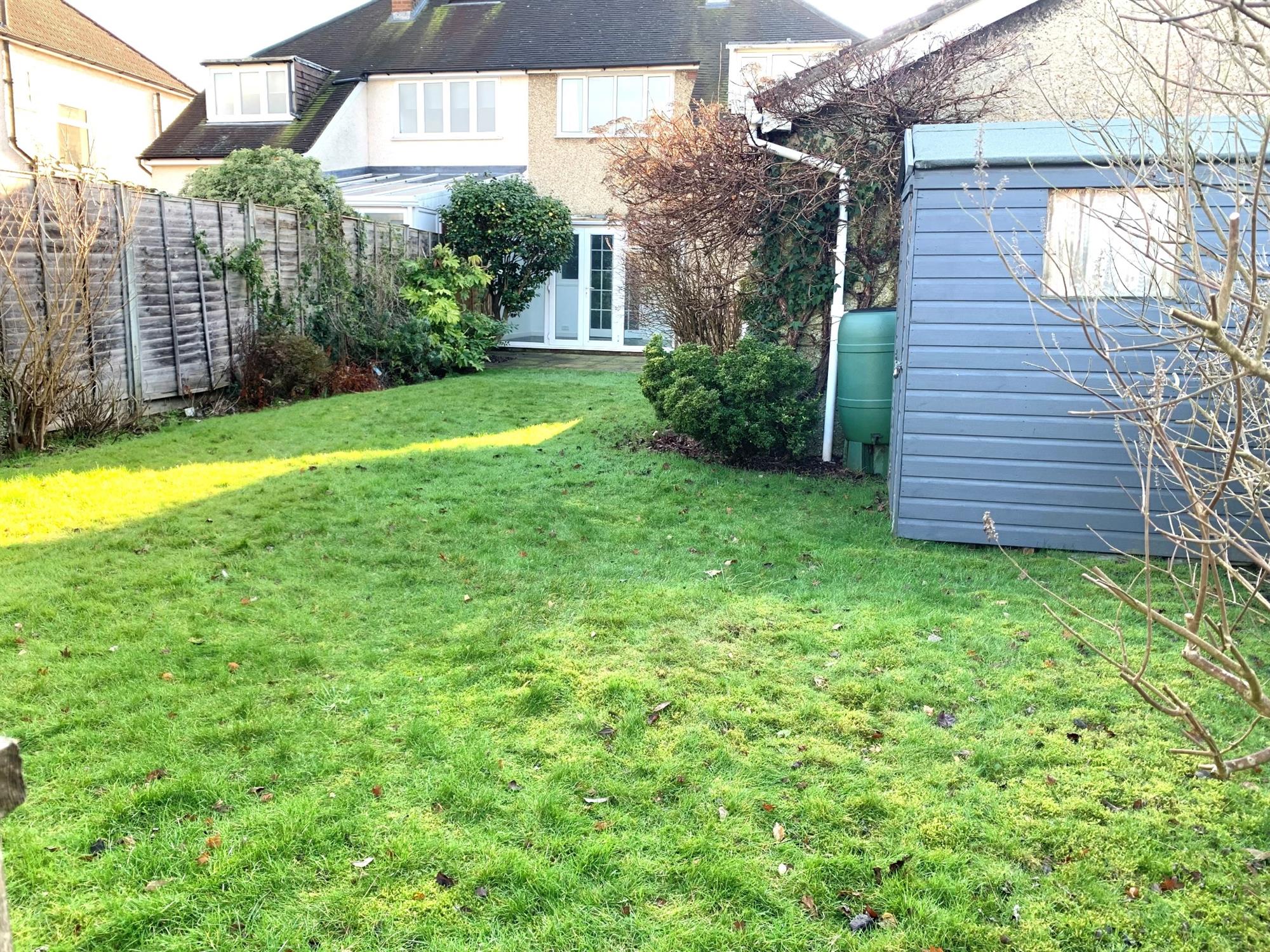 REAR GARDEN – Good size garden with patio area, garden shed and to the rear of garden are plots for vegetable patch. Gate to side. The garden backs onto Banister Tennis Court.
