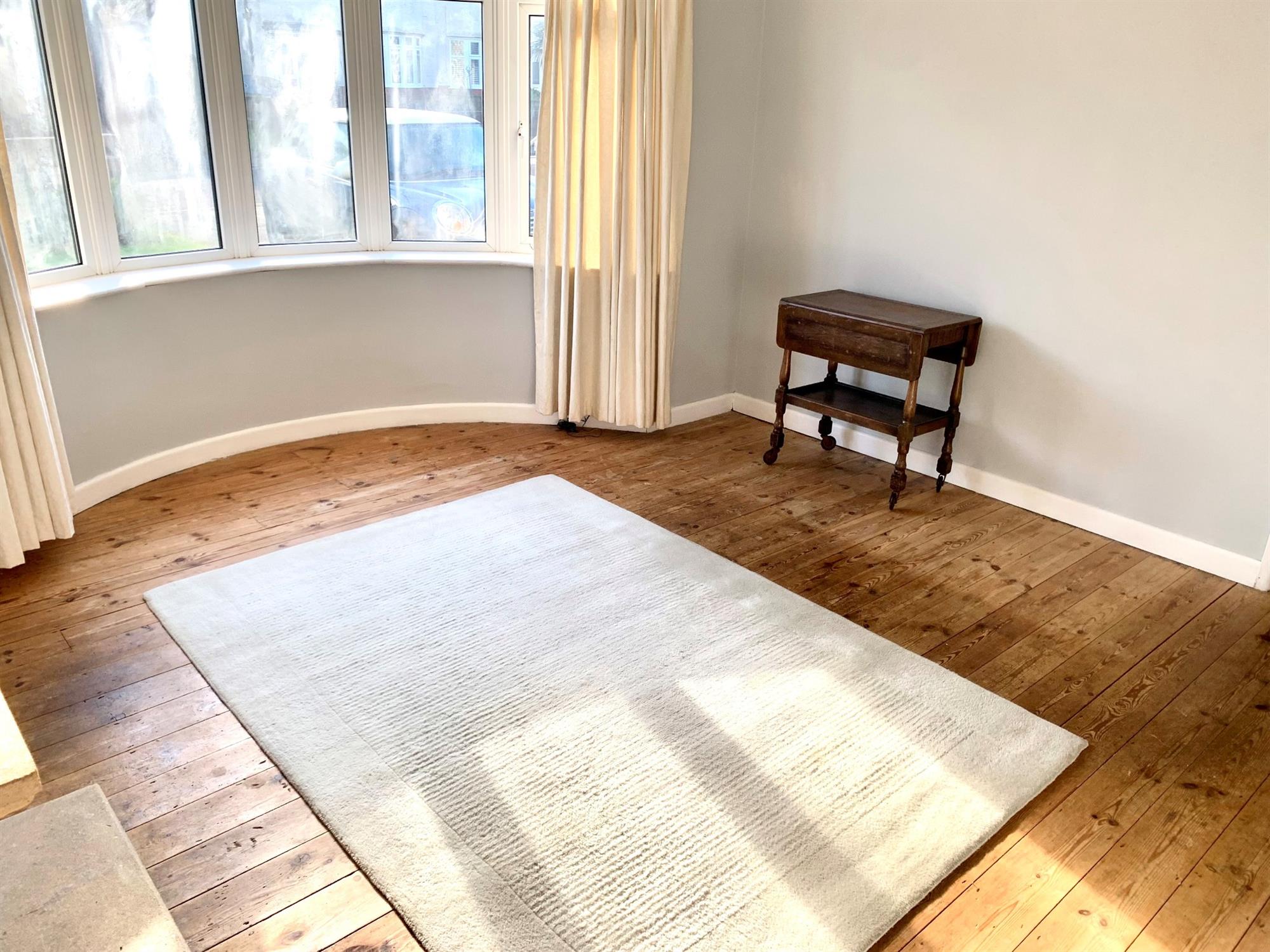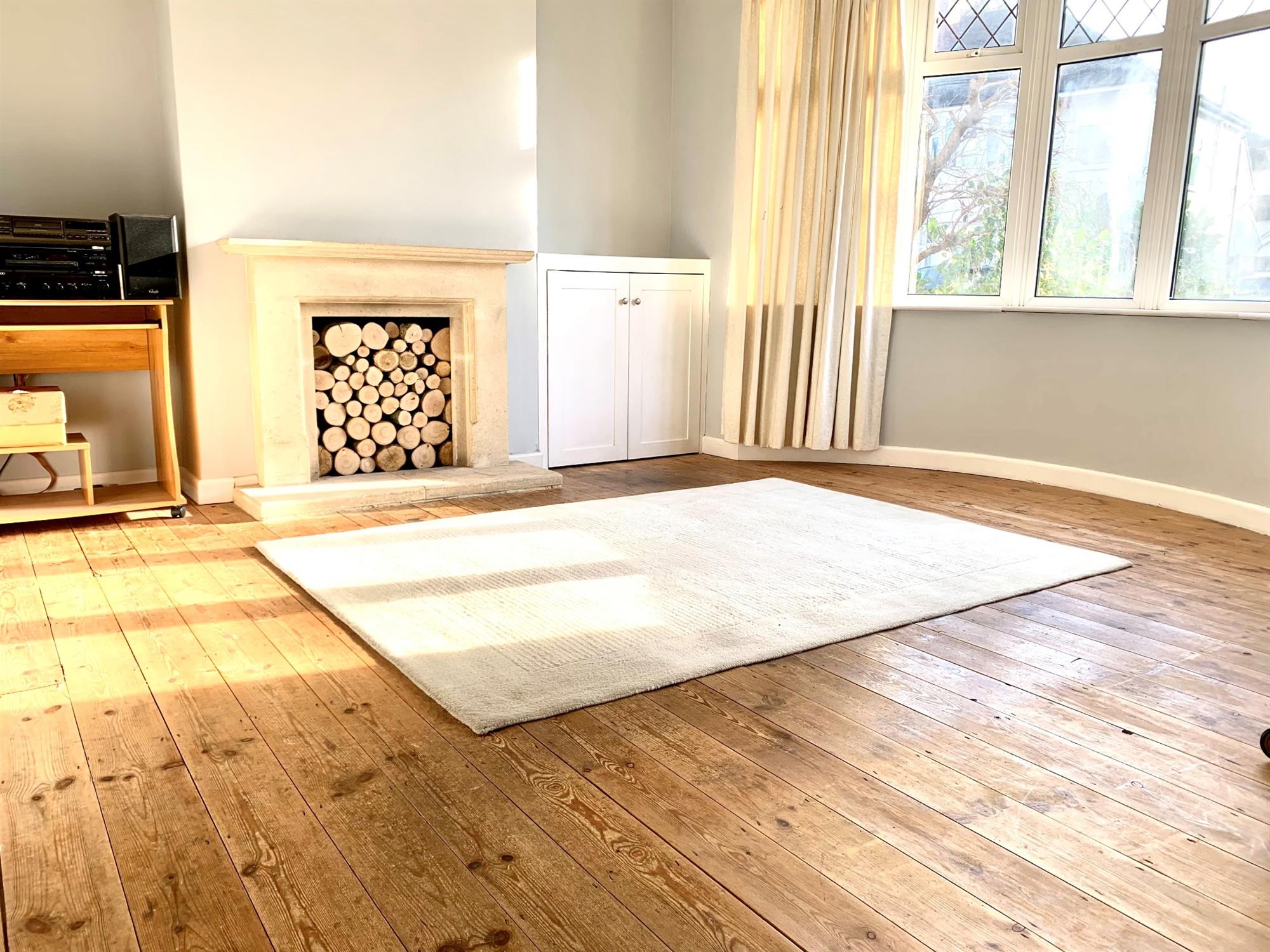 LOUNGE – Wood flooring with large bay window to front and ornamental fireplace.