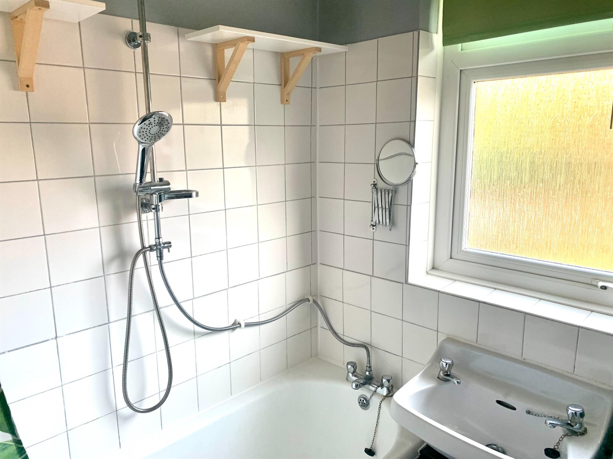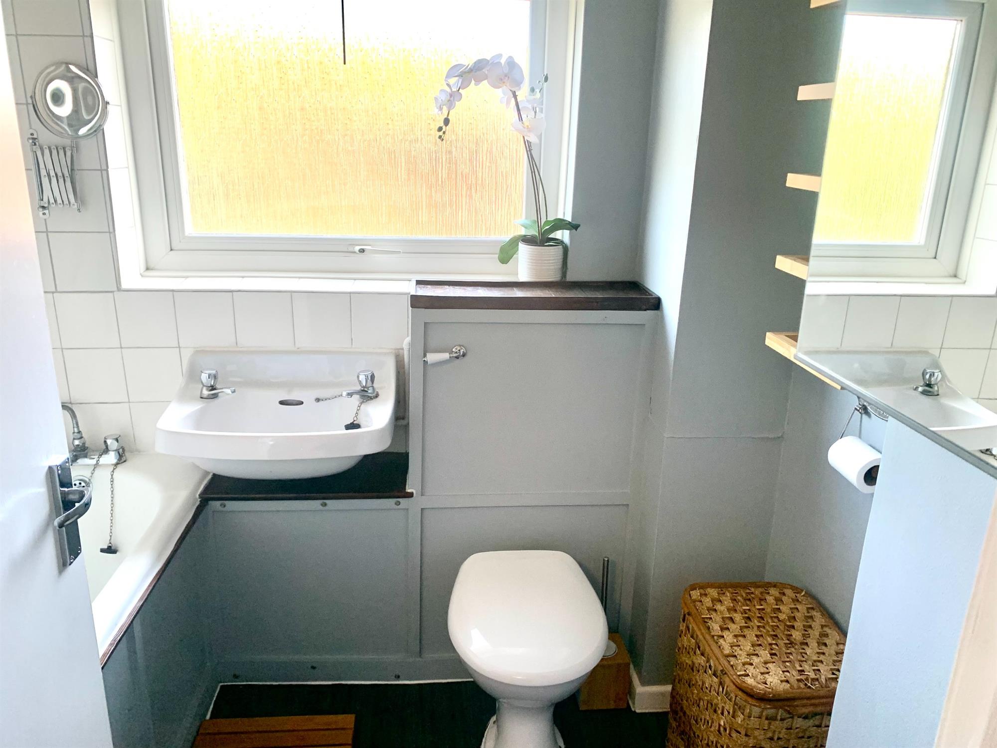 BATHROOM - White suite bathroom with shower over bath, sink and toilet.