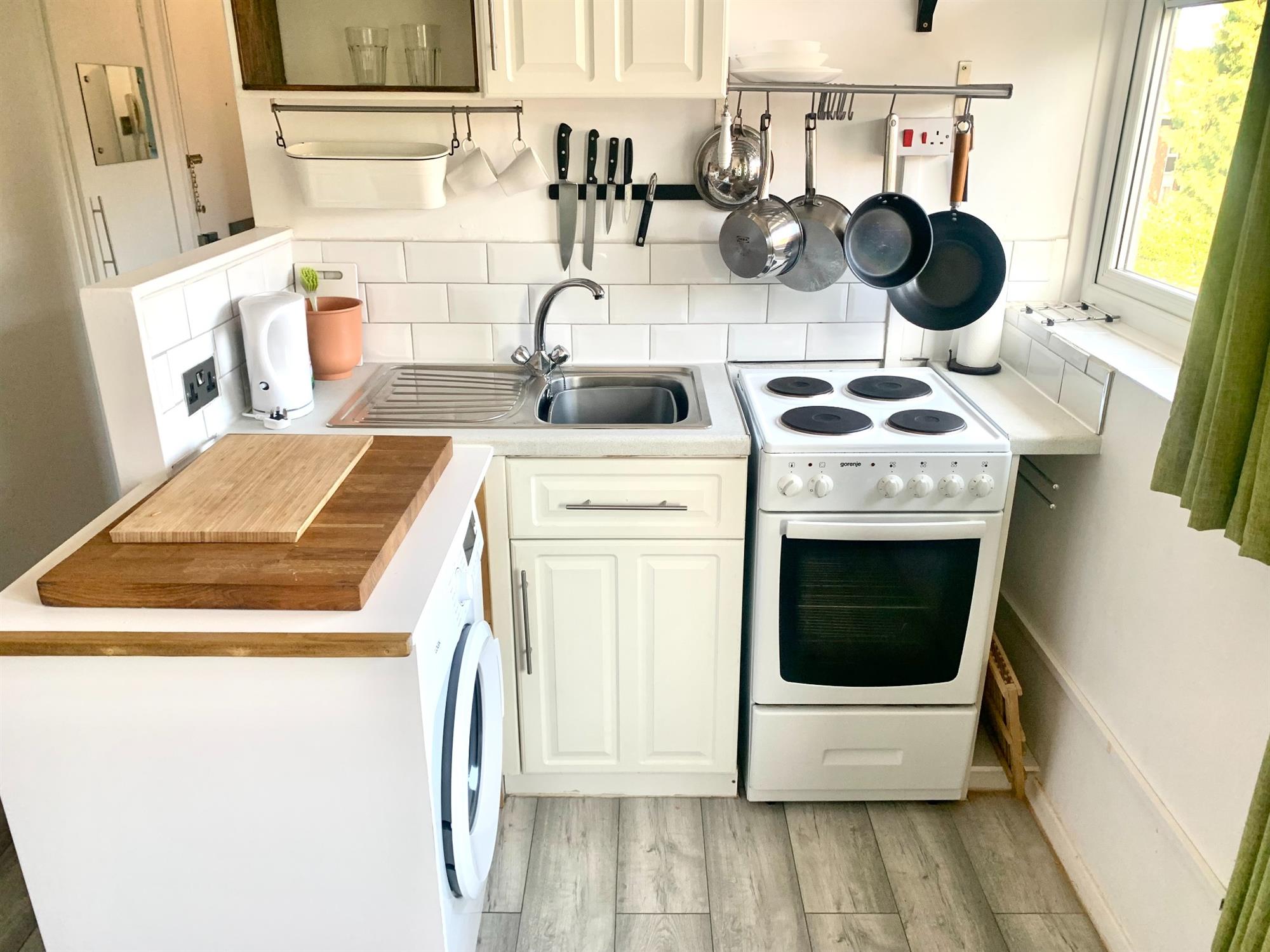 KITCHEN AREA - Kitchen incorporating electric oven, gas hob, washing machine and under counter fridge with small freezer section.