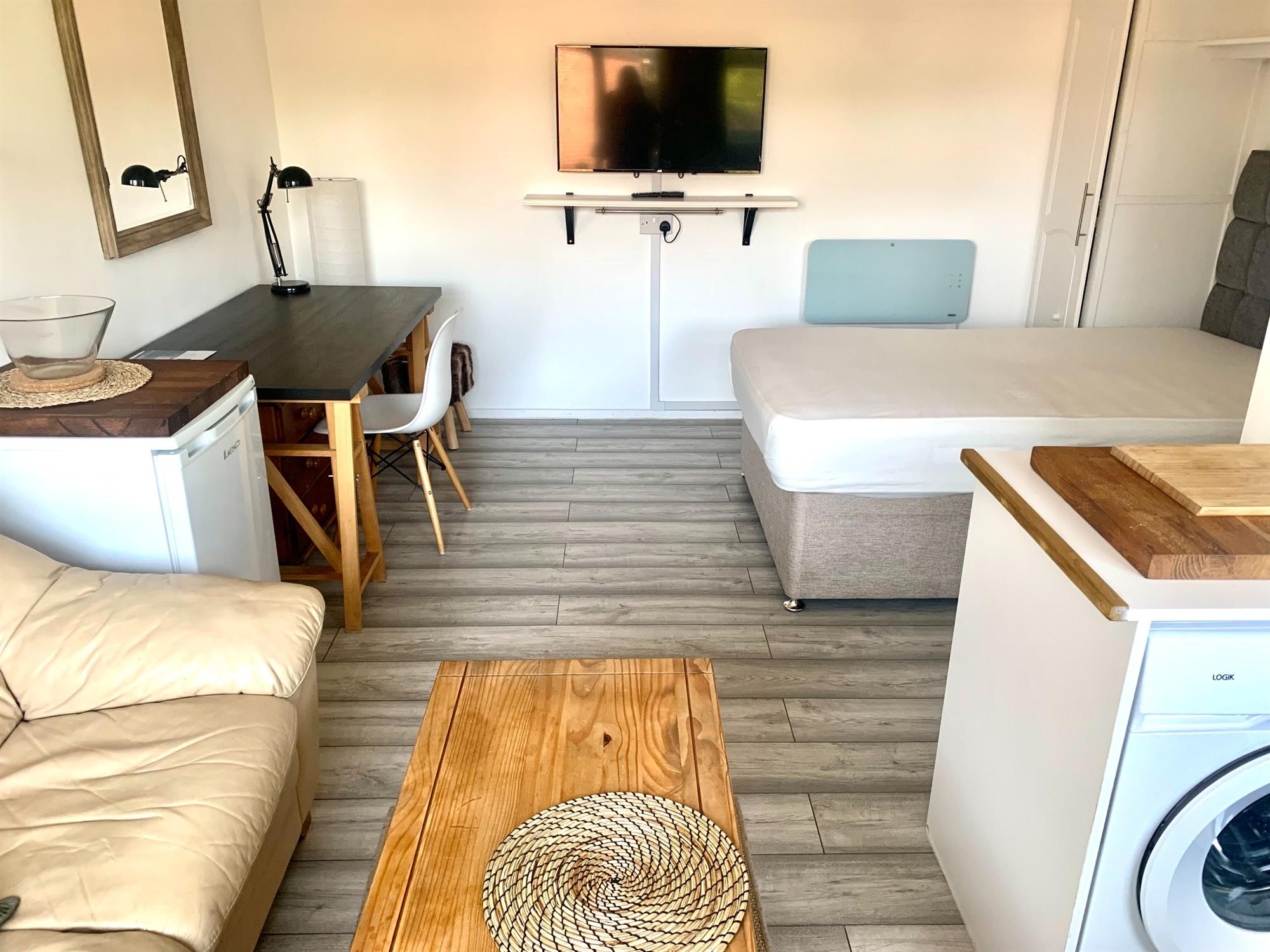 LOUNGE/BEDROOM - Open plan to kitchen. Built in wardrobe/cupboards with bed to centre. 2 seater sofa, desk, chair, set of drawers, coffee table and TV to wall.