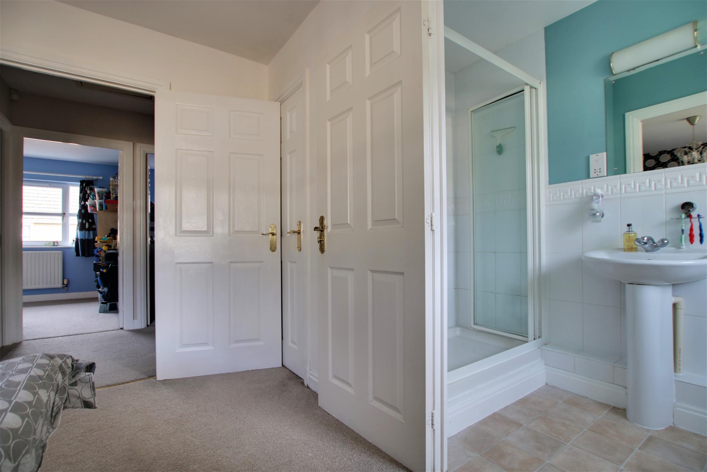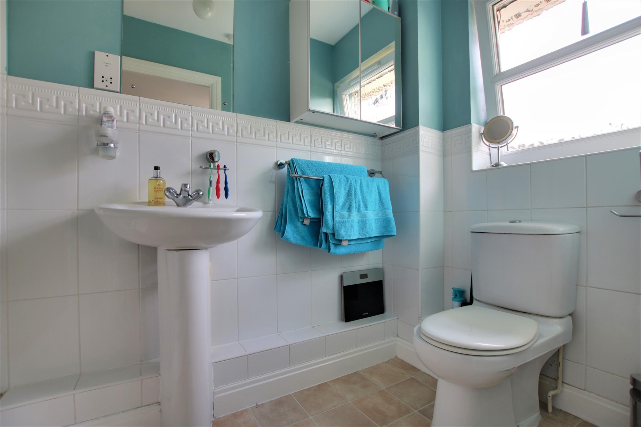 Vinyl flooring. Enclosed shower with foldiing glass door and bar valve shower unit, ceramic pedestal wash basin and w.c. Obscure double glazed window to rear aspect. Wall tiling to principal areas. Smooth walls and ceiling. Extractor fan. Radiator.