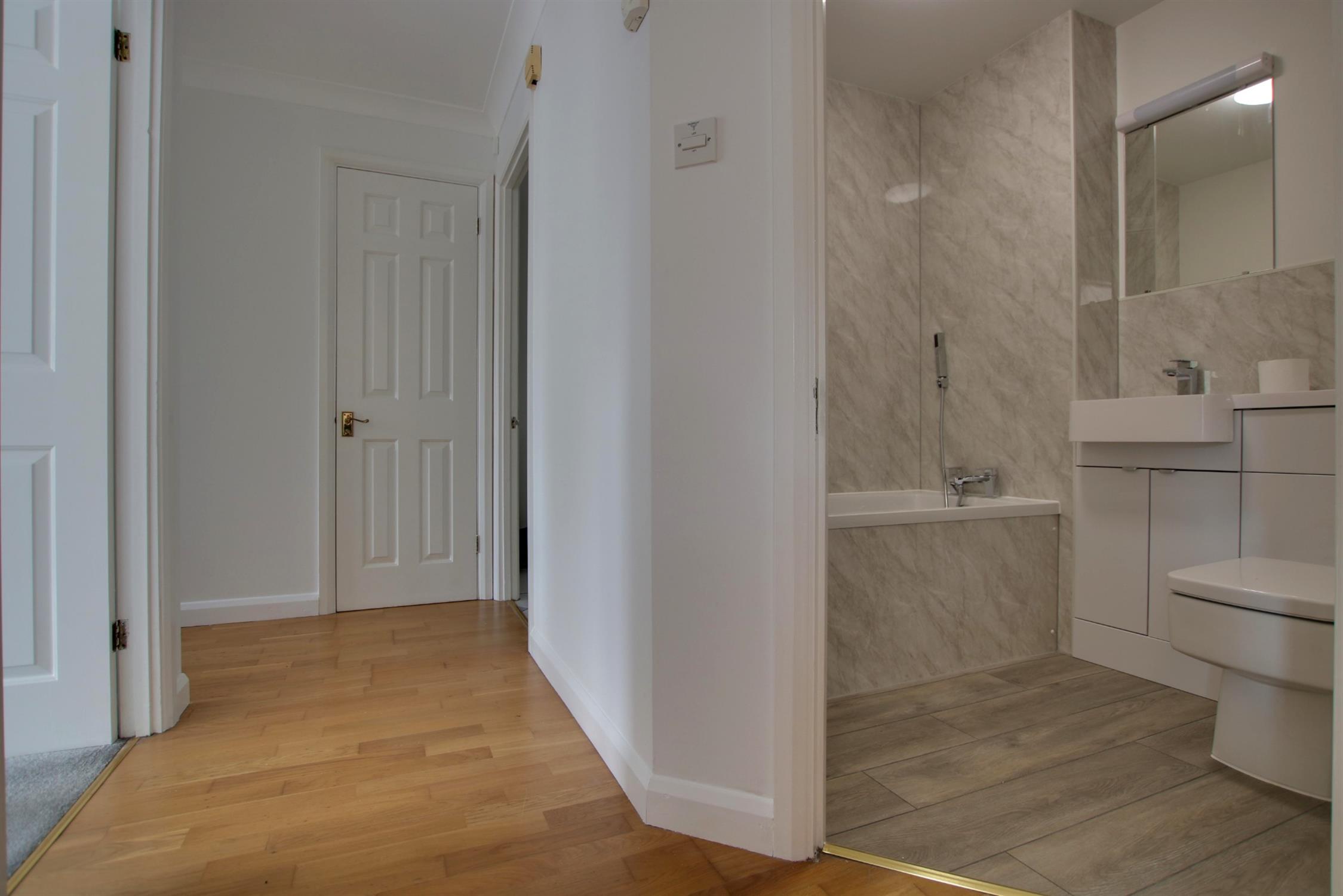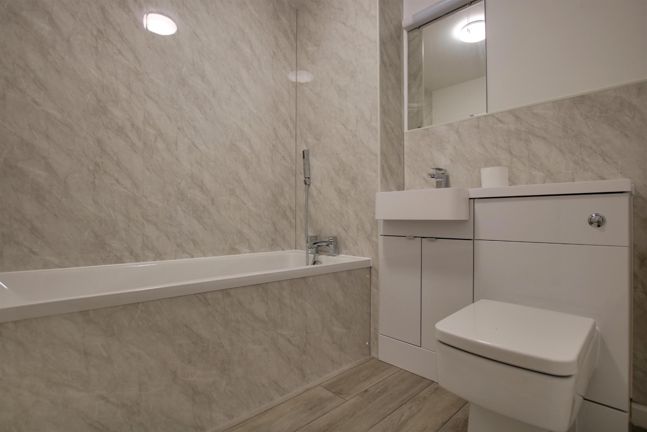 Wood effect laminate flooring. Panelled bath with mixer tap shower head over, vanity unit wash basin with storage under and hidden cistern w.c. Radiator. Wet wall panelling. Smooth walls and ceiling. Extractor fan.