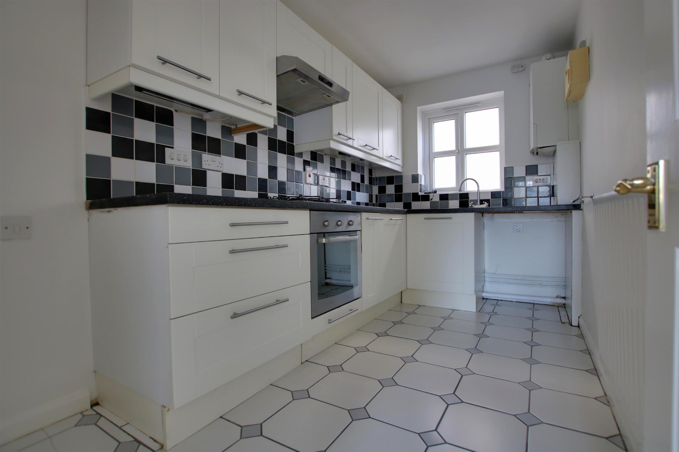 Tiled flooring. Matching wall and base units with worktop over. Space for tall standing fridge/freezer and washing machine. Electric oven with four ring gas hob and extractor over. Double glazed window to side. Worcester combination boiler. Smooth walls and ceiling. Radiator. Tiled splash back. Sink and drainer.