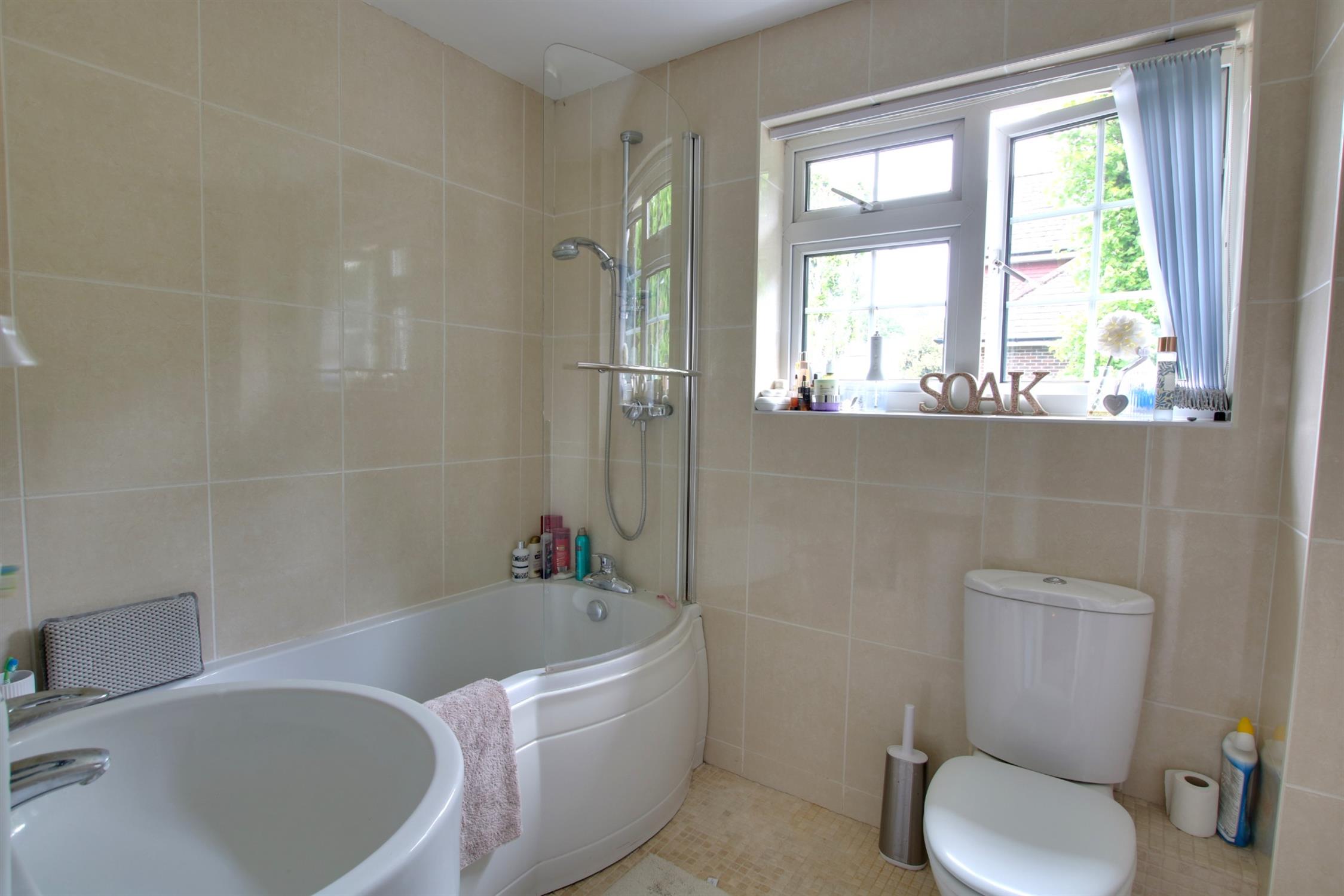 A contemporary three piece suite comprising; space saving panelled bath with shower over, low level w.c. and pedestal wash hand basin. Georgian style double glazed window. Chrome finish ladder style towel rail. Tiled wall surfaces. Tiled flooring.
