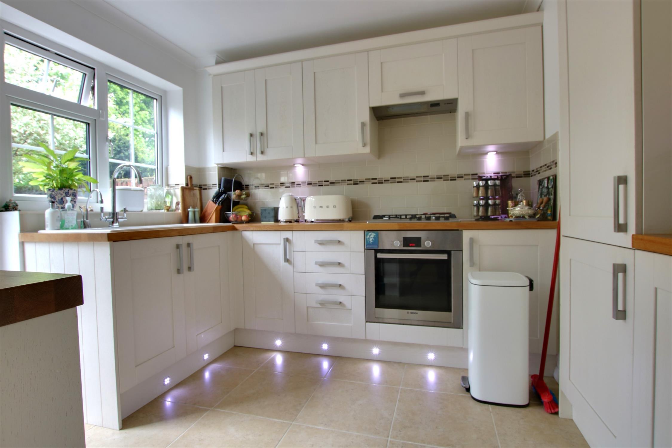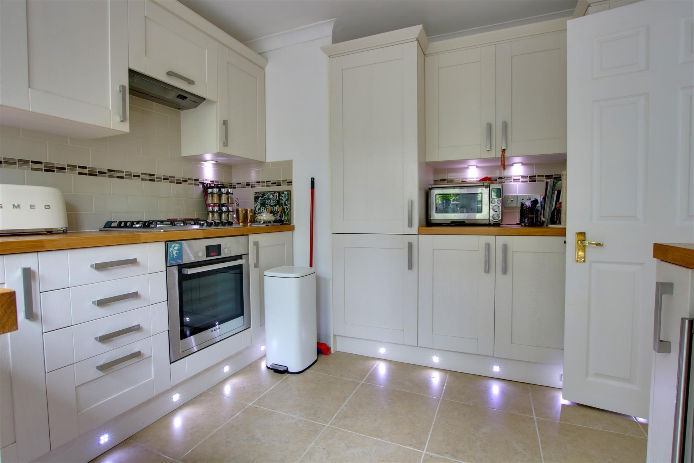 A comprehensive range of eye and base level units to include Villeroy & Boch single drainer sink unit with mixer tap fitting. Built-in oven with gas hob and extractor hood over. Integrated wine cooler. Suitable space and plumbing for automatic washing machine, integrated dishwasher. Tiled splash backs. Georgian style double glazed door and window to rear garden. Downlighters to worktop surfaces and downward integrated lighting within kick boards. Tiled flooring.