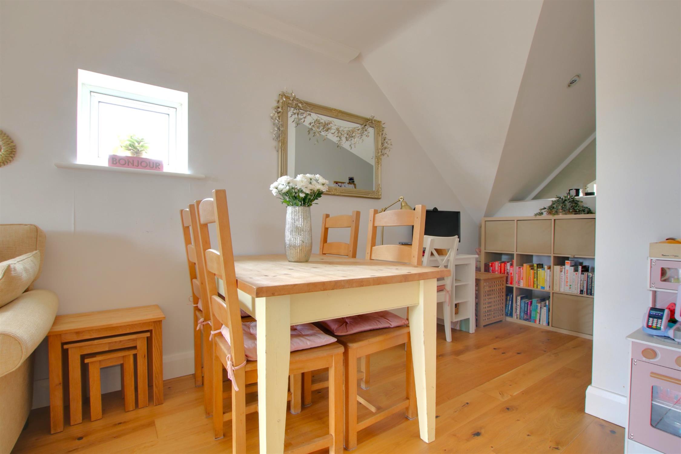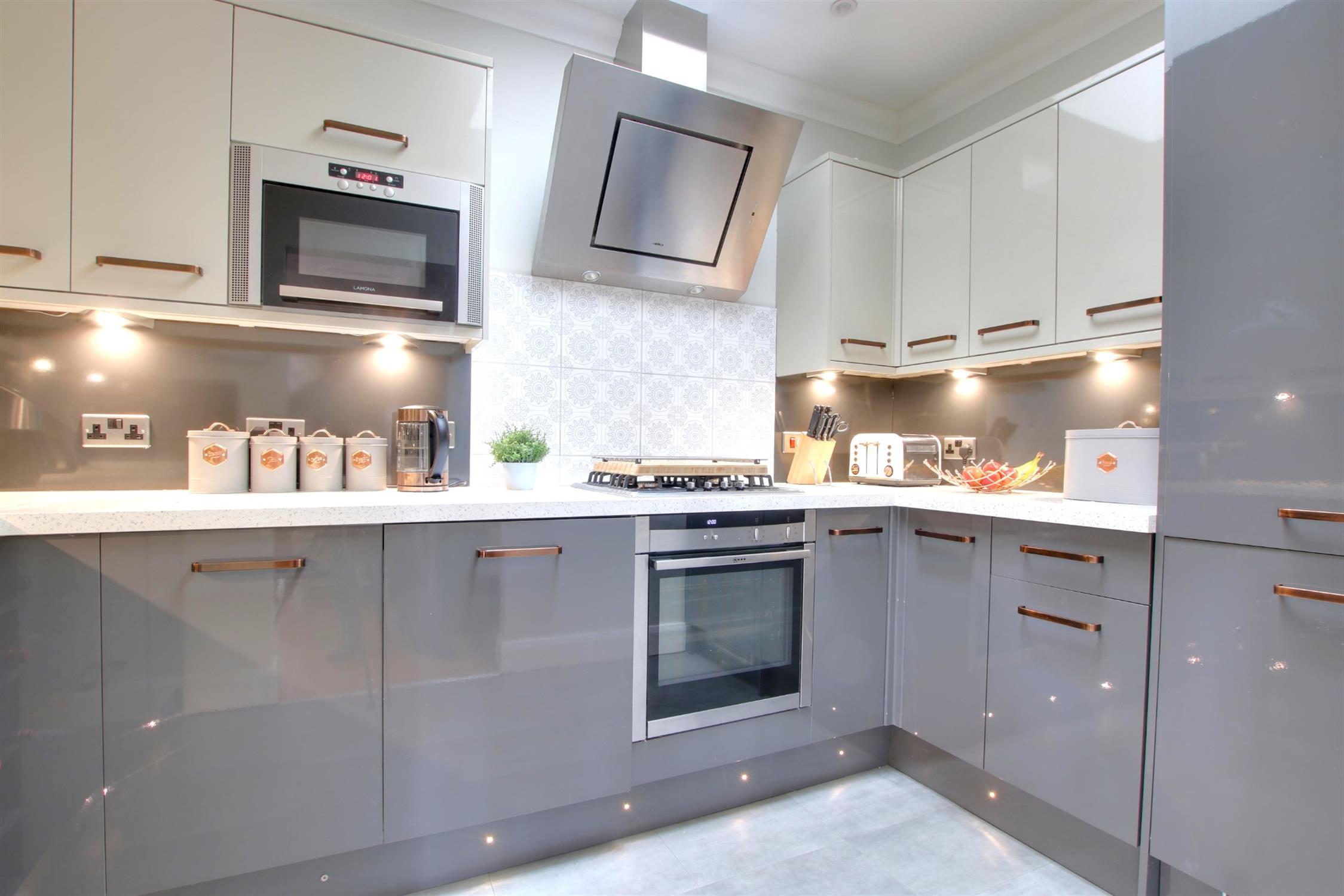 Laminate flooring. Matching wall and base units with tiled splashback. Inset sink with drainer. Integrated fridge-freezer, washing machine, dishwasher, microwave, electric fan oven, gas hob with extractor hood. Double-glazed skylight.