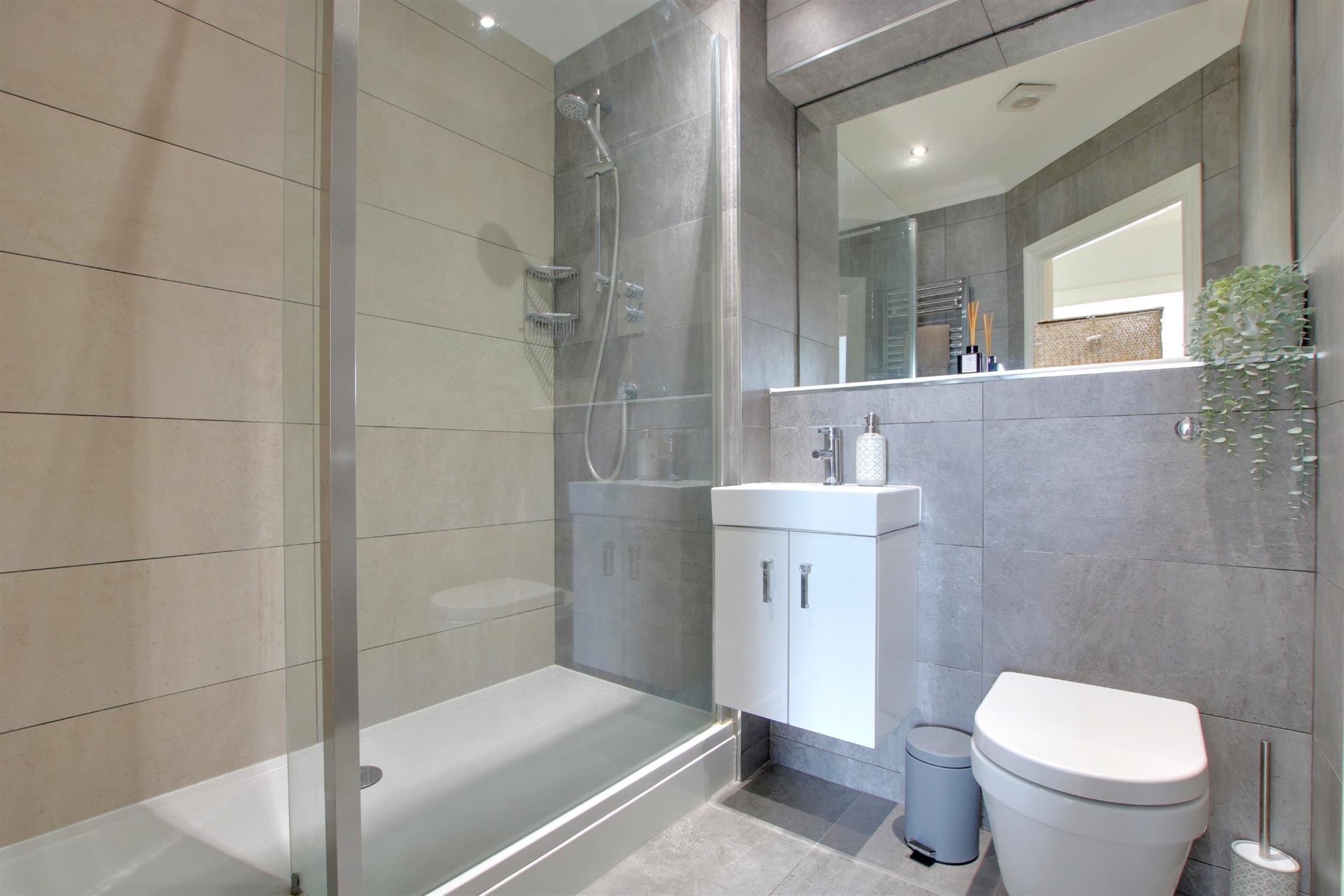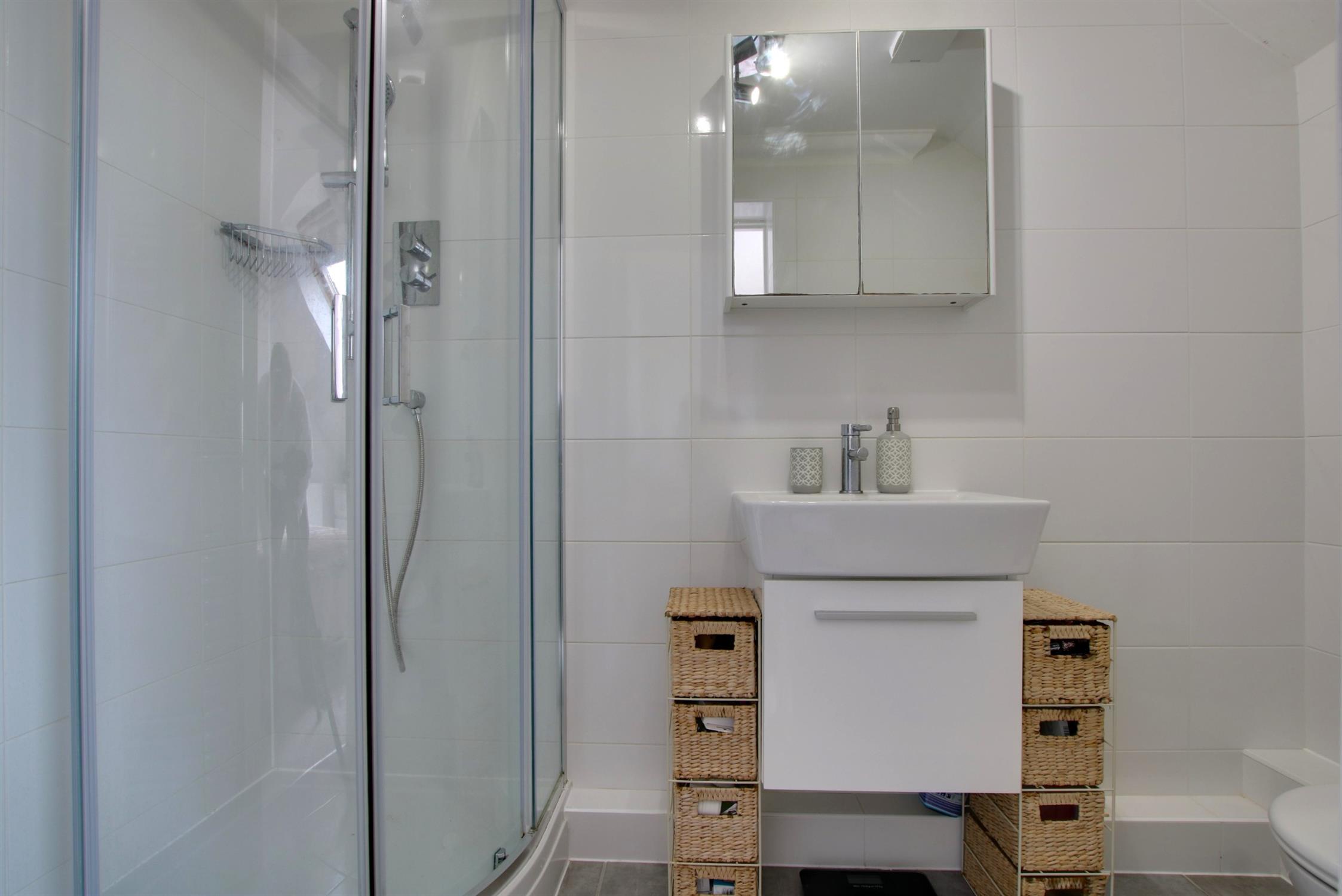 Tiled flooring and walls. Walk in shower cubicle. Low level W.C and wash basin. Extractor fan. Heated towel rail.