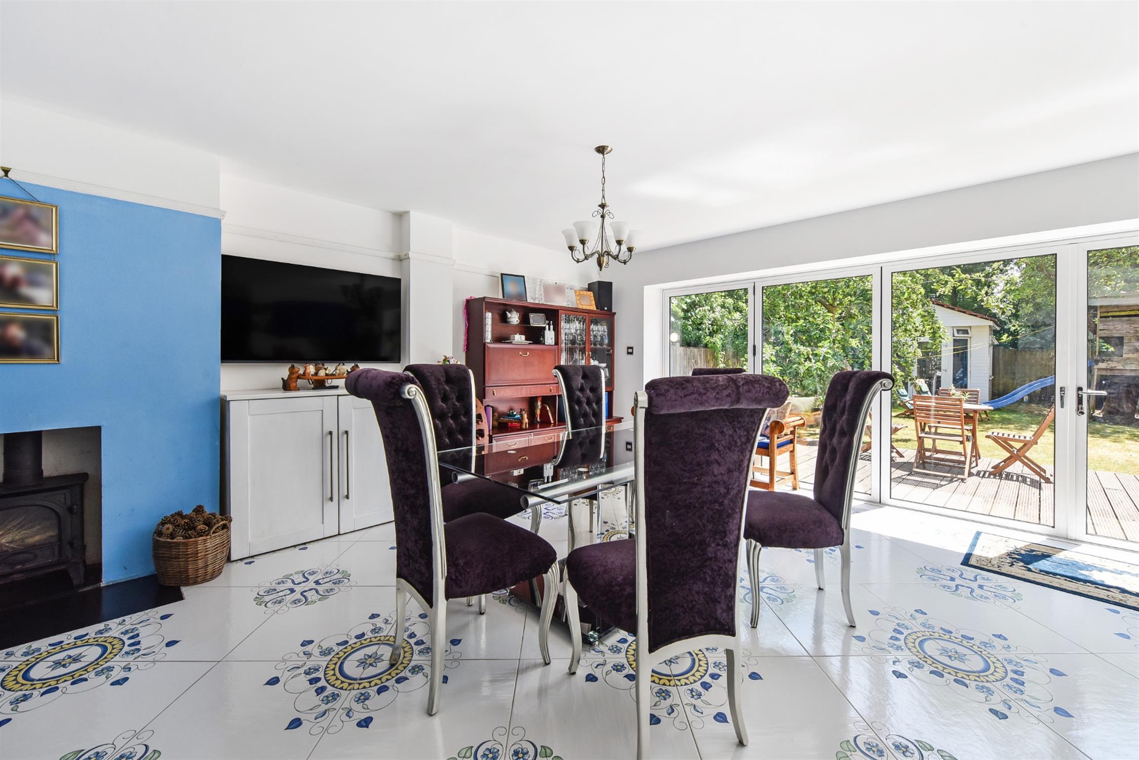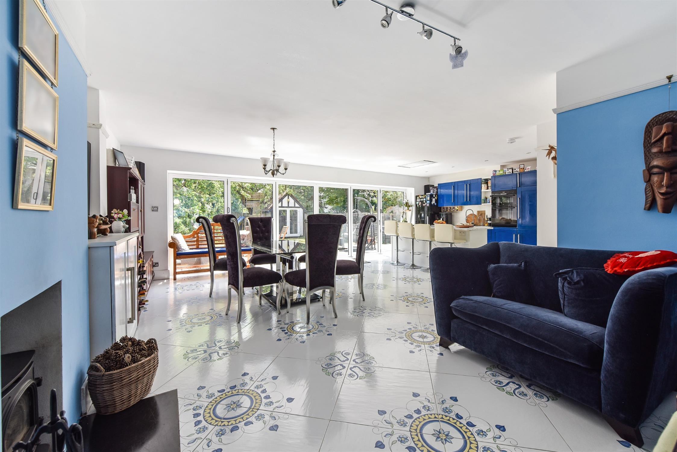 The current owners have completed this substantial extension to the home and the space now offers a natural hub. A comprehensive range of eye and base level units to include built-in oven. Double drainer sink unit with draining cupboard above. Integrated dishwasher. The central island feature offers breakfast bar/dining facility as well as integrated hob and flush fitting ceiling mounted extractor fan. Ample space for dining room table and chairs as well as further space suitable for sofa which also centres around a feature fireplace which benefits from a log burner. Feature tiled flooring benefitting from underfloor heating. Extensive range of bi-fold doors giving a feeling of bringing the outside into the property which stretch across the rear elevation. Smooth plastered ceiling with recessed lighting. Picture railing. Door leading to garage.