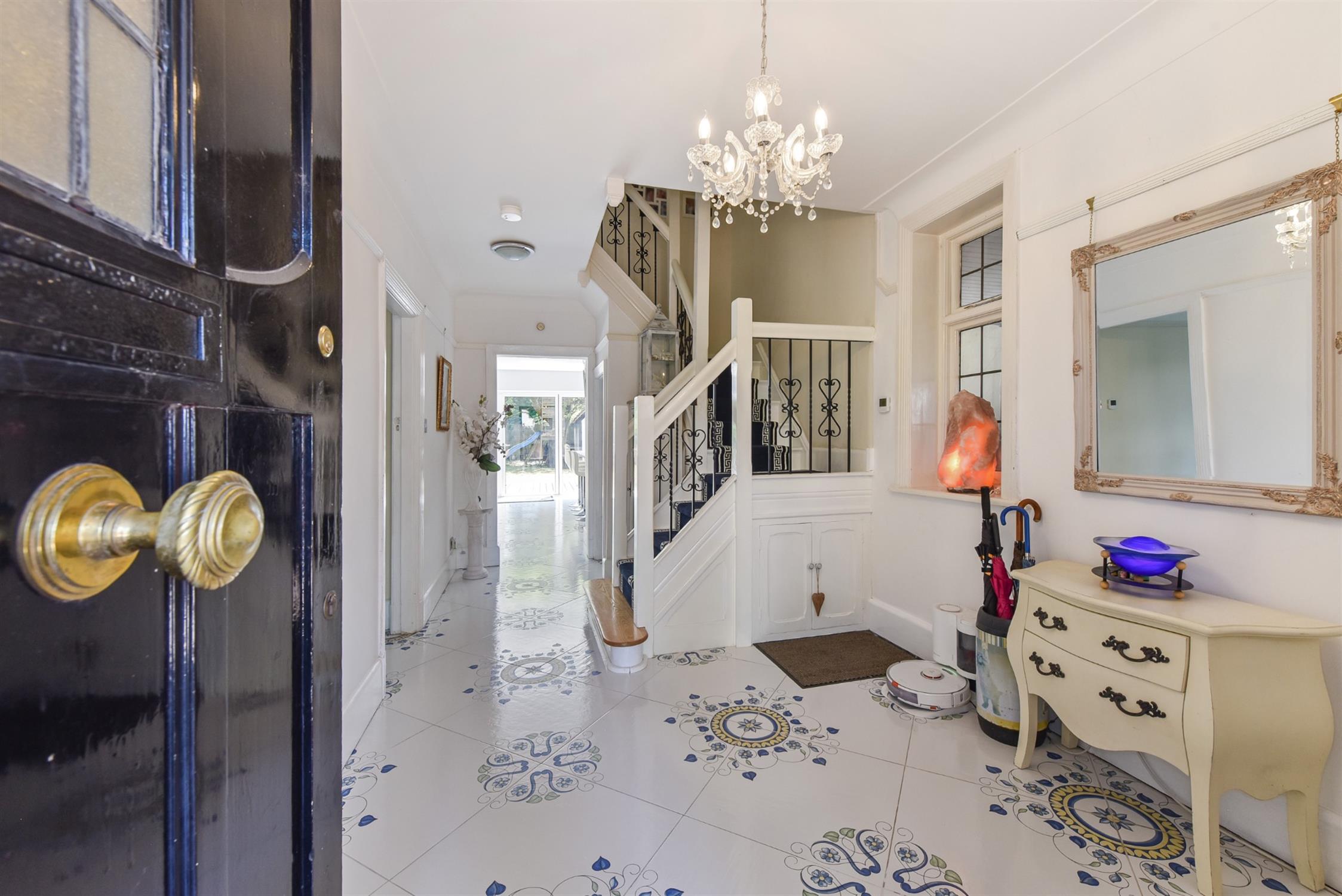 Leaded obscure glazed window to front elevation. Built-in storage cupboard. Smooth plastered and coved ceiling. Picture railing. Leaded glazed window to side elevation. Impressive feature tiled flooring with underfloor heating. Superb feature stair case with ornate balustrading leading to the first floor landing.