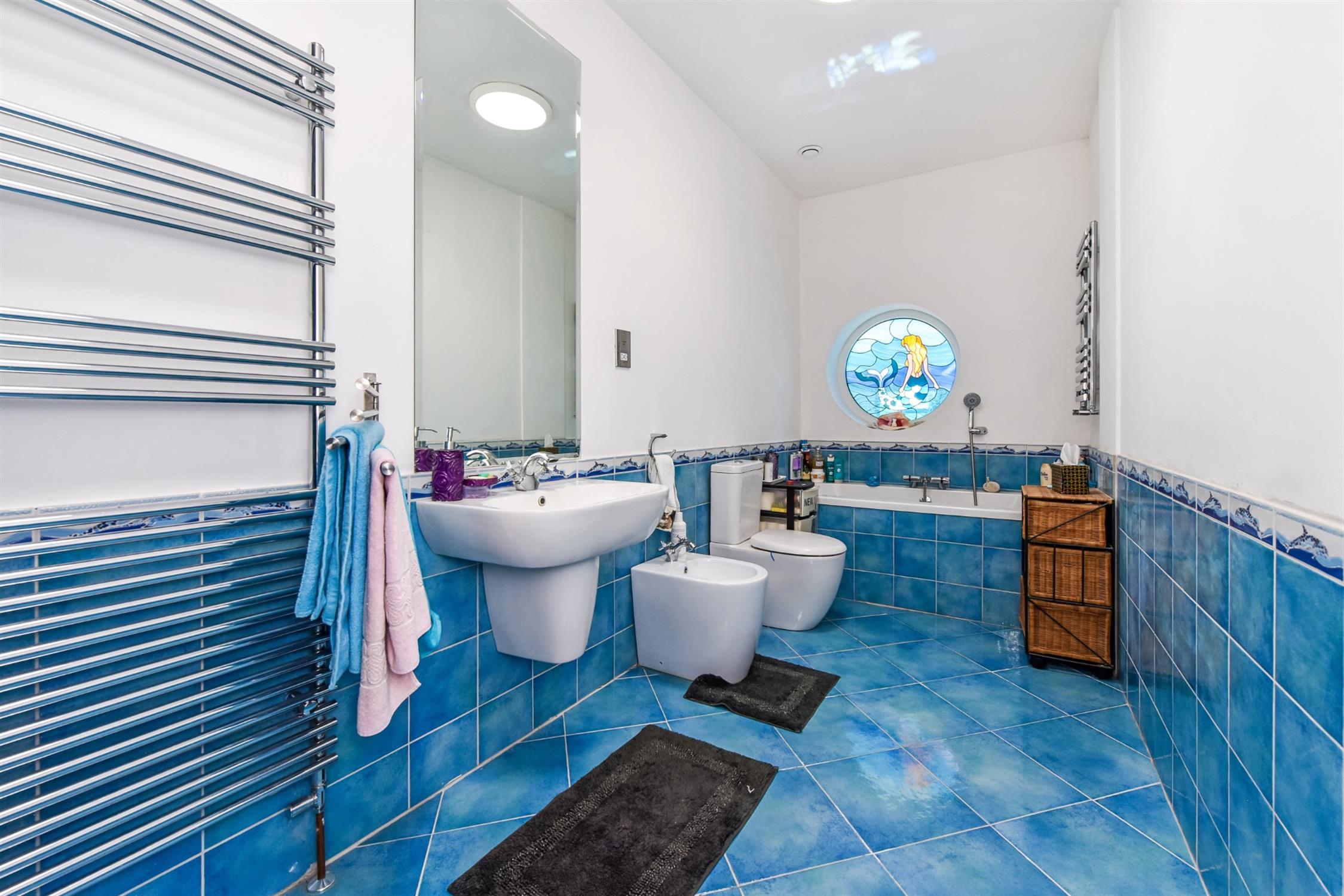 A particularly generously proportioned room with a five piece suite to include large walk-in shower, tiled finish panelled bath with central tap filler and hair washing attachment, low level w.c., bidet and wall hung hand basin. Partially tiled wall surfaces. Tiled flooring with underfloor heating. Two chrome finish ladder style towel rail/radiator combination. Feature circular window with stained glass insert. Smooth plastered ceiling. Recessed lighting. Ceiling mounted extractor fan.