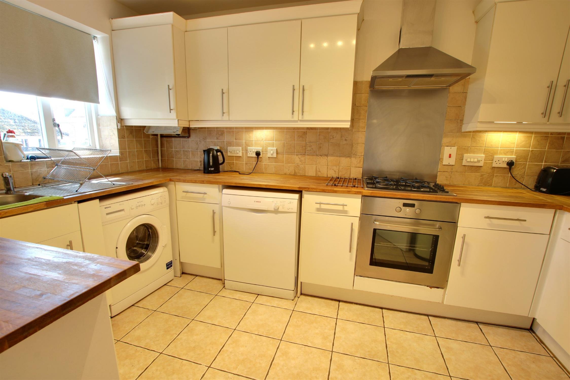 Tiled flooring. Matching wall and base units with tiled splashback. Inset sink with drainer. Space for washing machine, dishwasher and fridge-freezer. Integrated cooker, gas hob and extractor hood. Double-glazed window to front aspect.