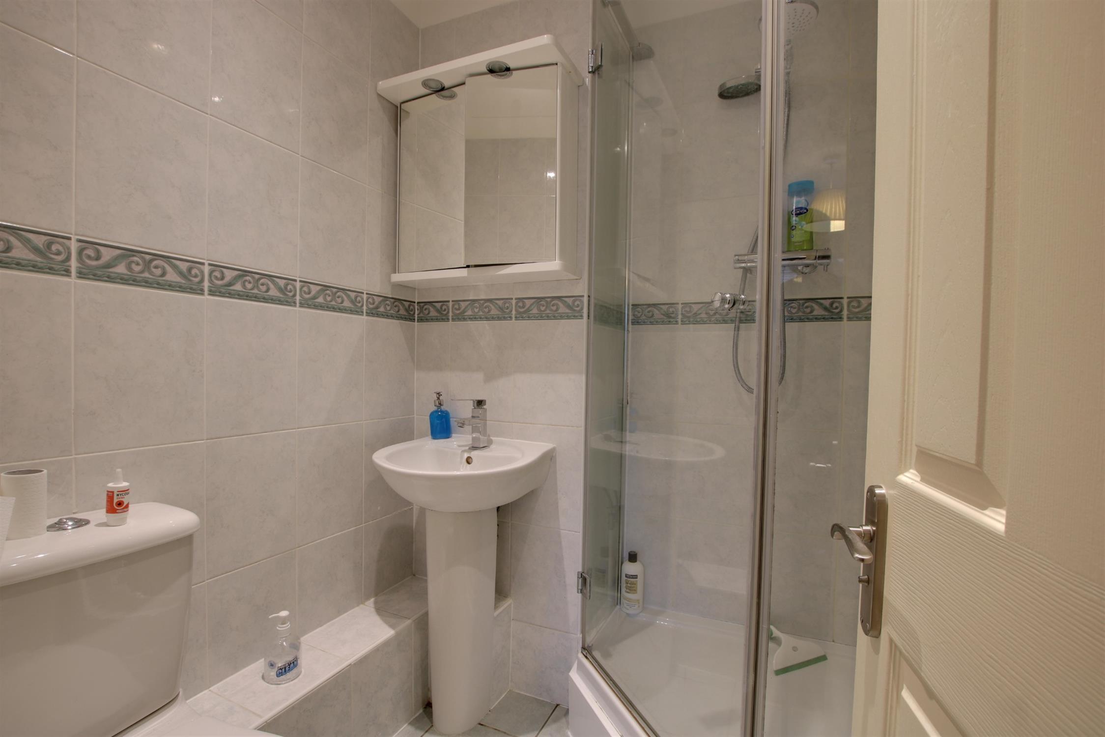 Fitted three piece suite comprising; quadrant style shower, pedestal wash hand basin and low level w.c. Smooth plastered and coved ceiling. Recessed lighting.