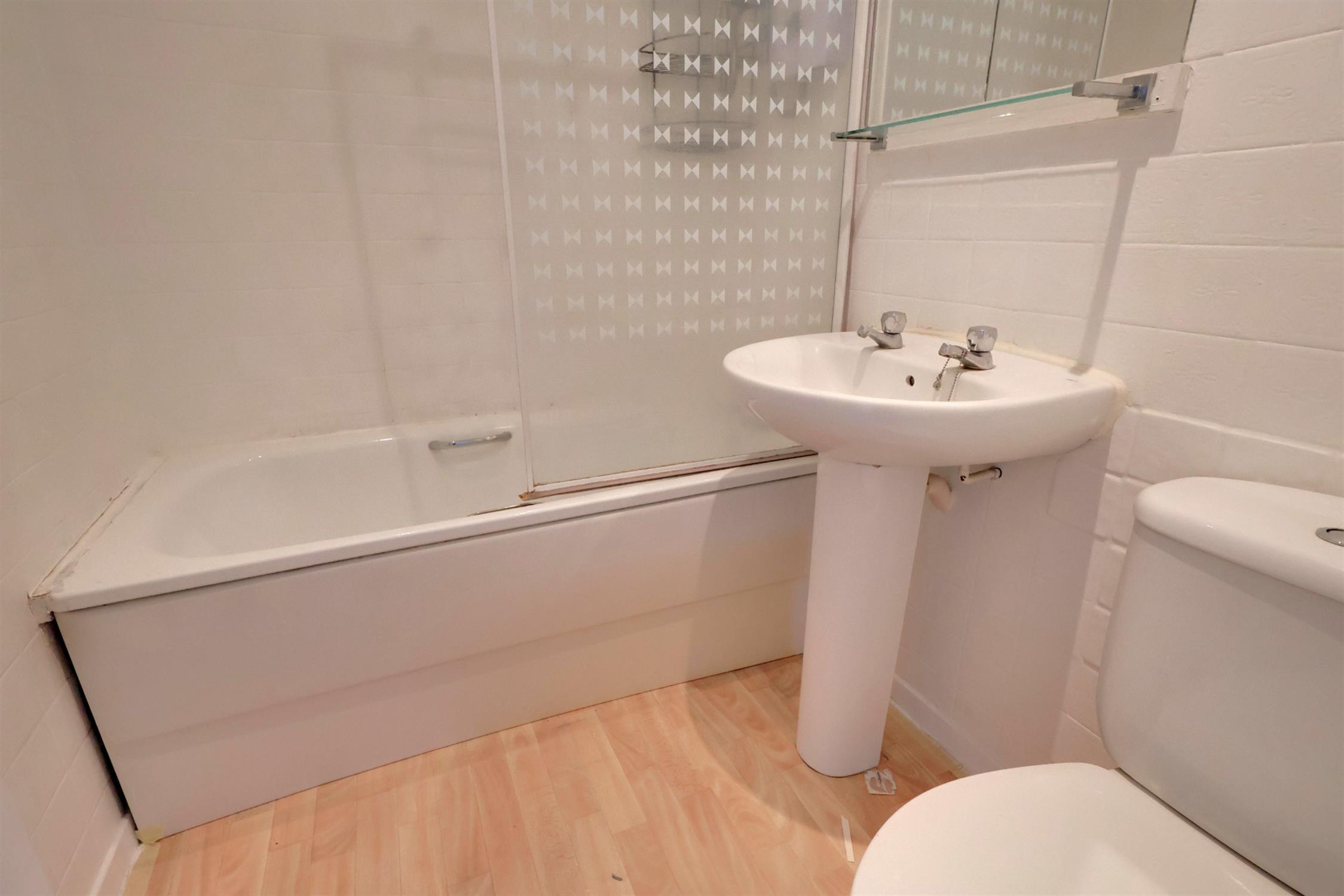 Panelled bath with shower screen and shower attachment. Low level W.C. Pedestal Sink. Tiled walls and lino floor.