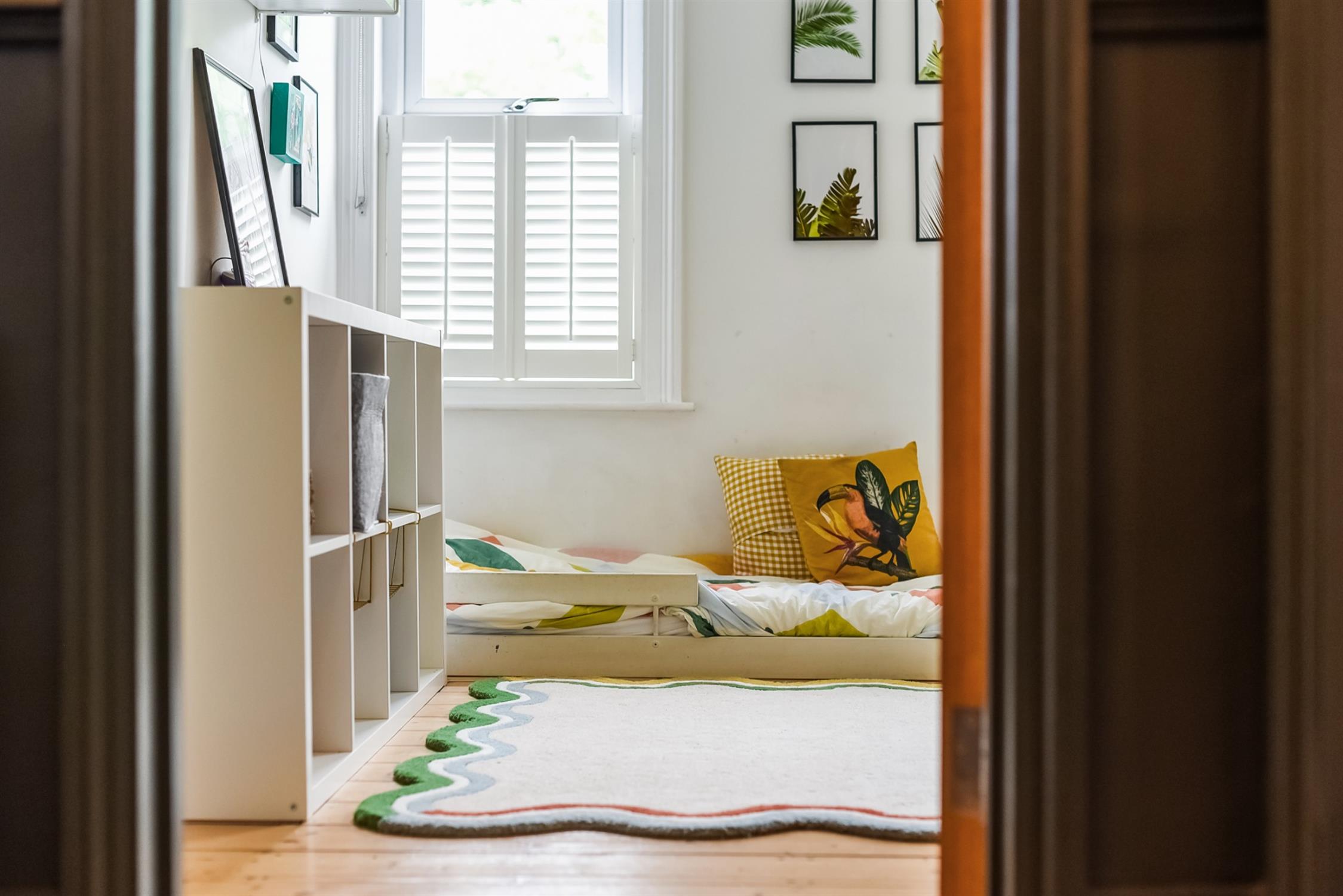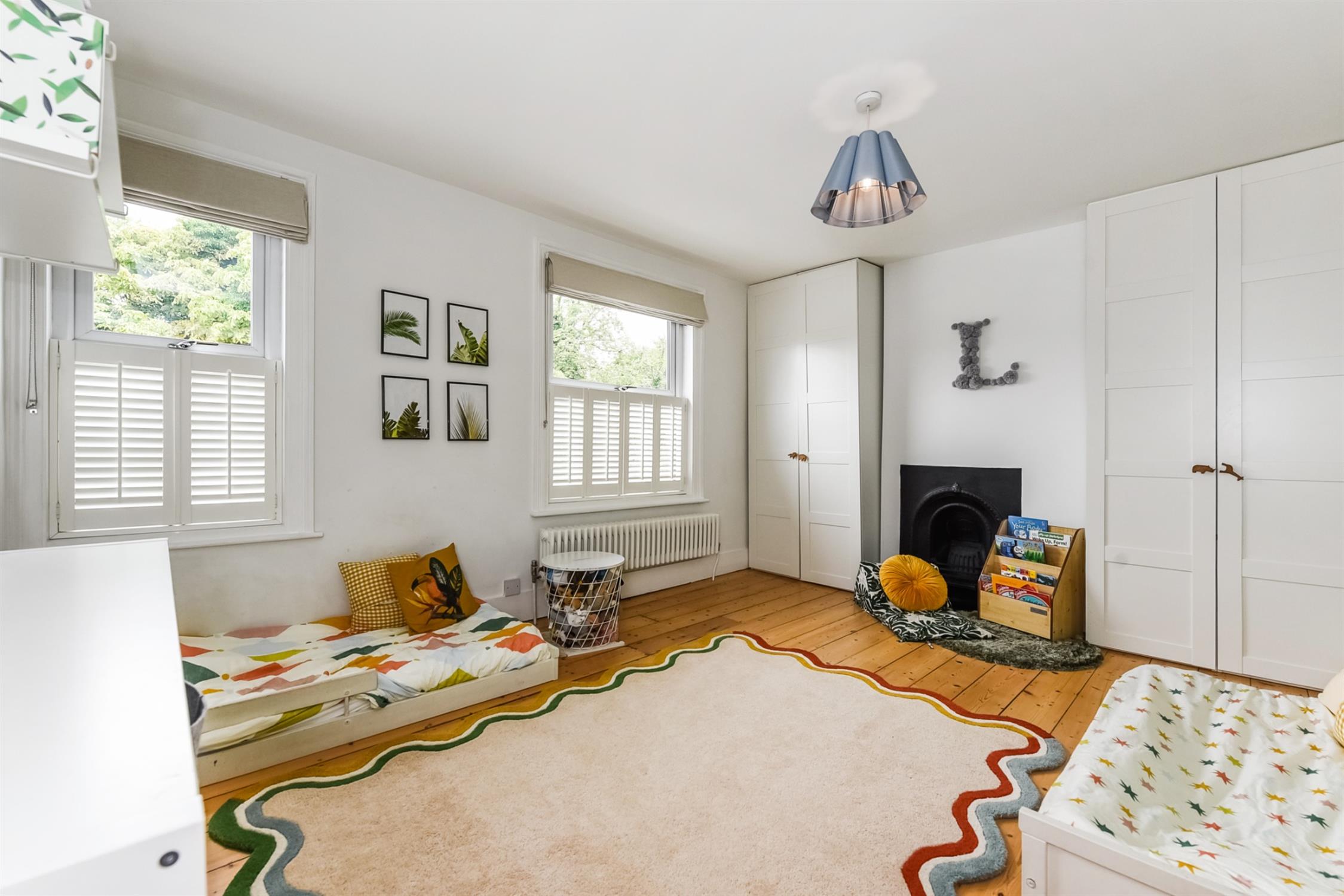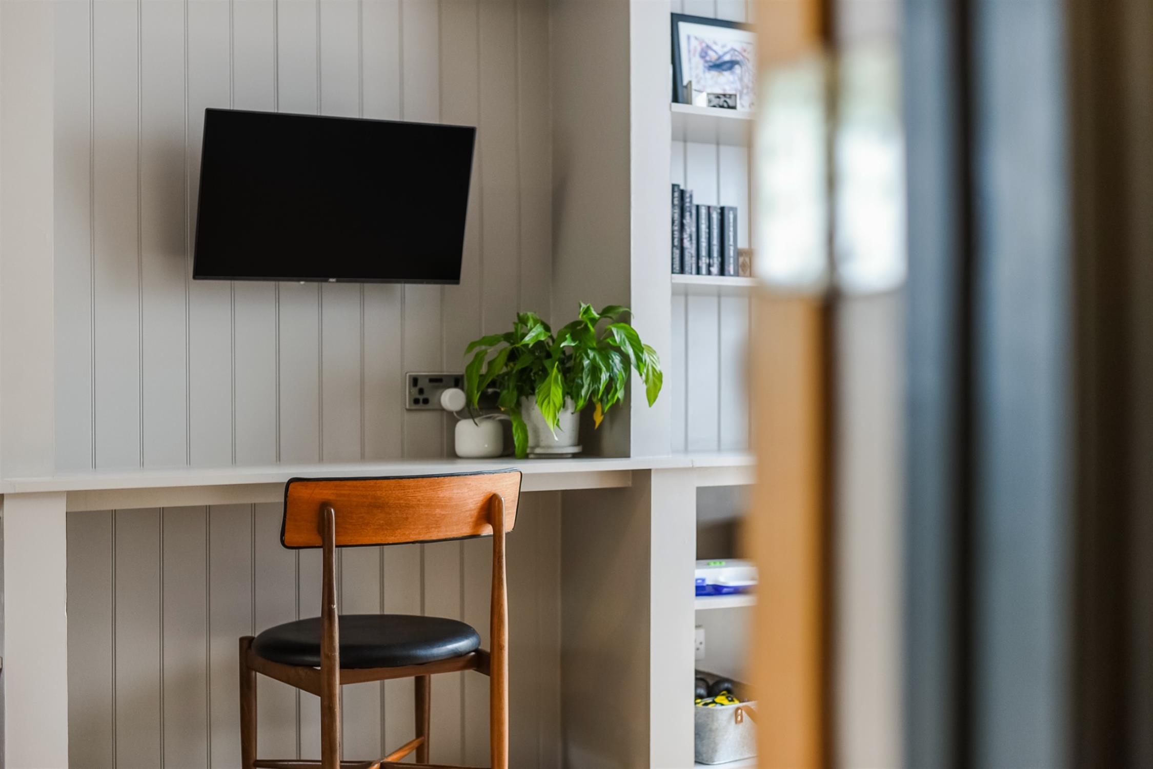A spacious room, with two distinct sections. Feature fireplace with solid hearth, mantle and surround. Inset woodburner. Double-level shutters. A range of bespoke storage shelves surrounding a desk area with electrics and Cat 6 socket.