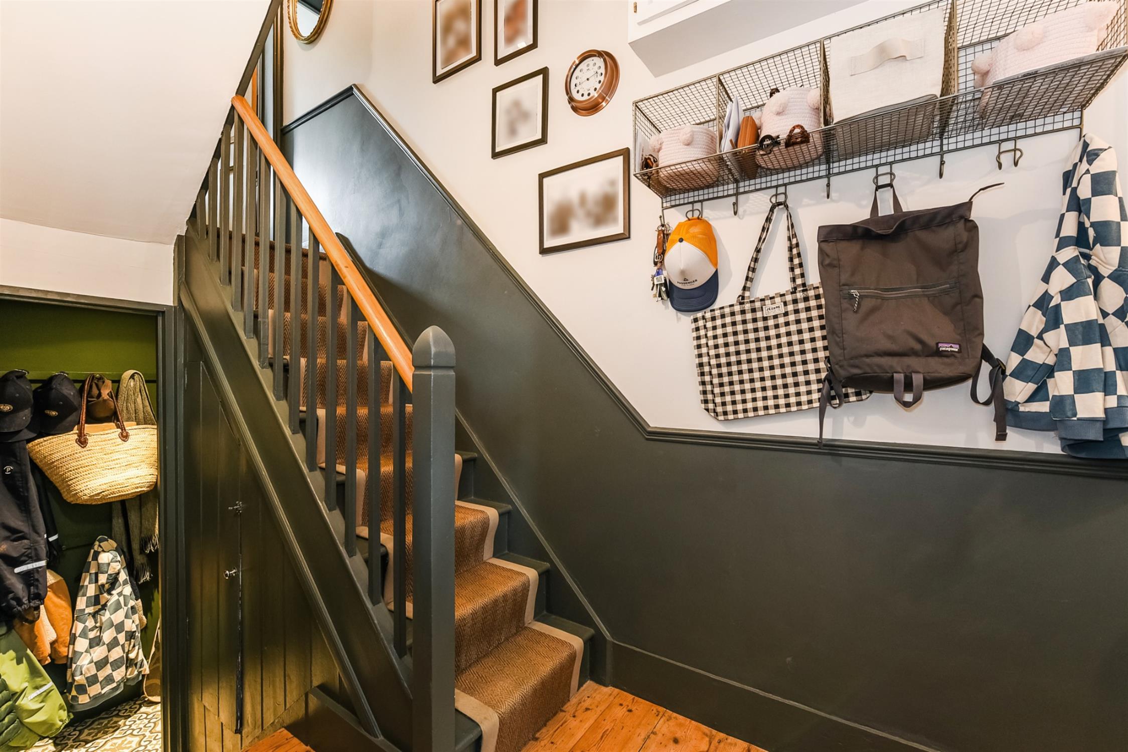 Fitted coir matt. Attractive decoration with dado rail. Stairs rising to first floor with centre carpet runner. Down some steps is a handy cloakroom area for shoes and coats. Storage under the stairs. Characterful solid wood floors continue into the living room.