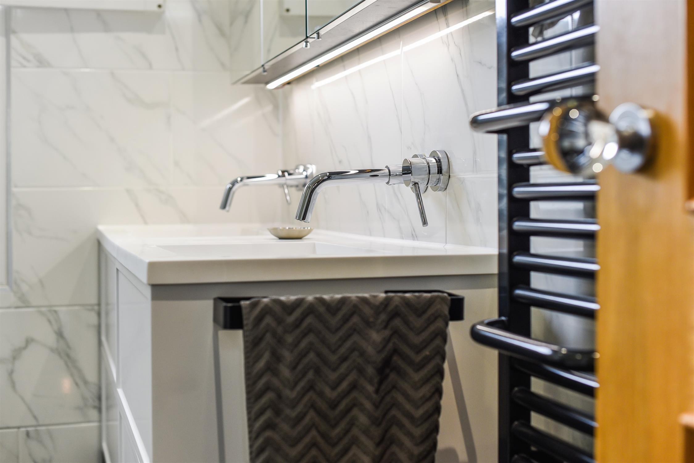 Vanity unit with storage and large format sink with two separate taps. Contemporary tiling. Bath with shower over. Toilet. Large storage cabinet. Heated towel rail.
