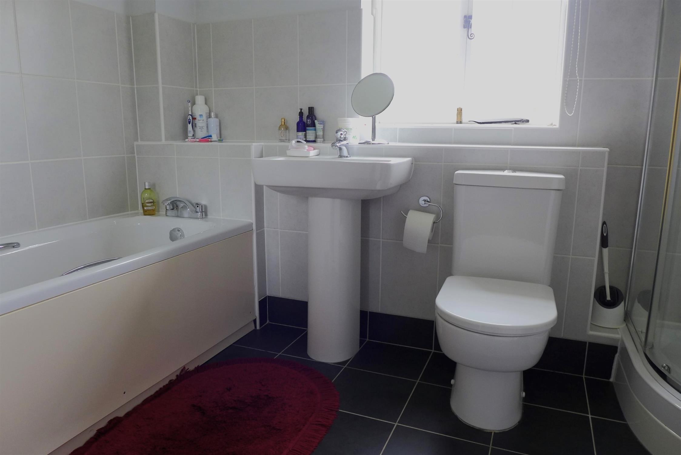 FAMILY BATHROOM: Modern white suite comprising WC, wash hand basin, bath, separate shower cubicle and heated towel rail.