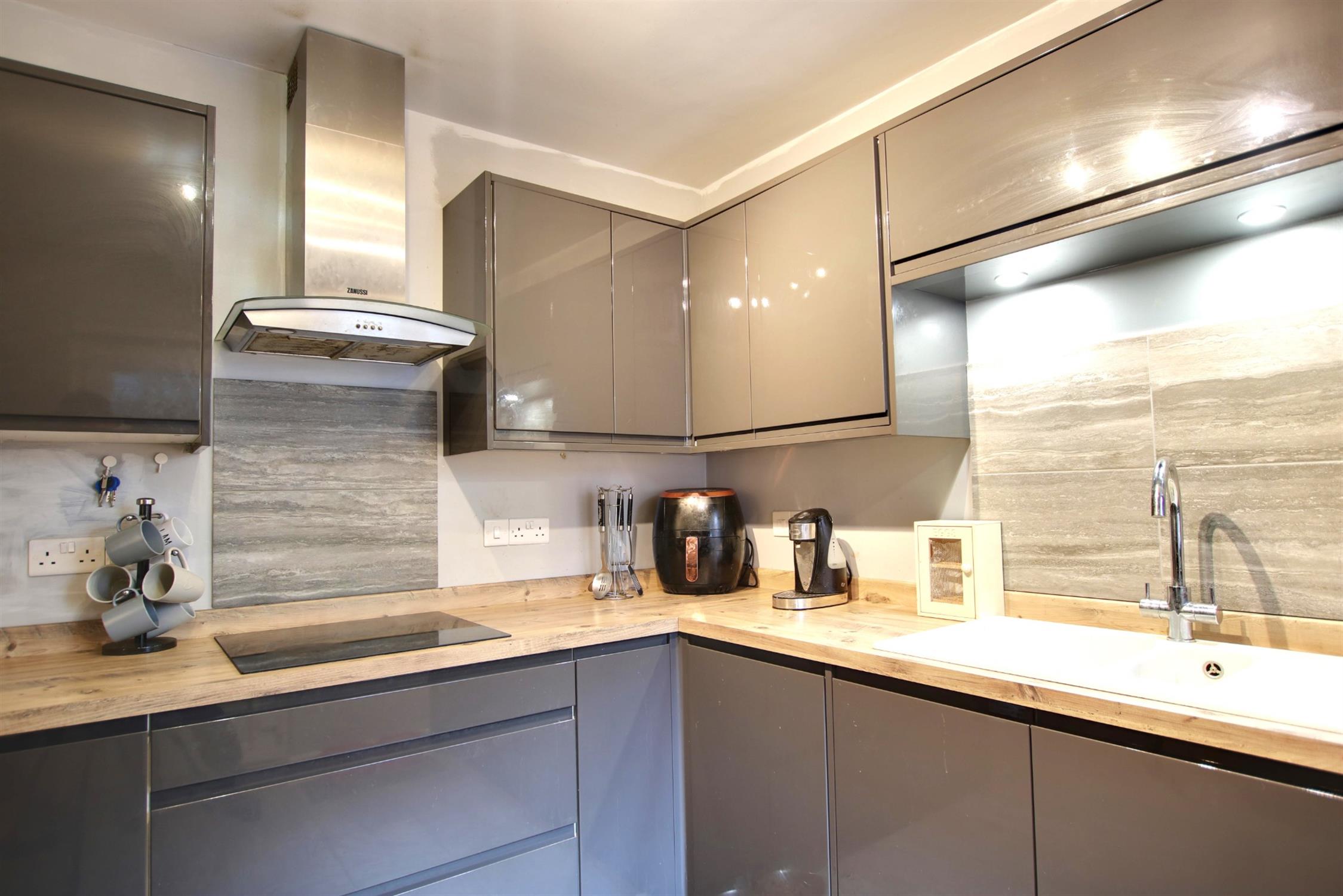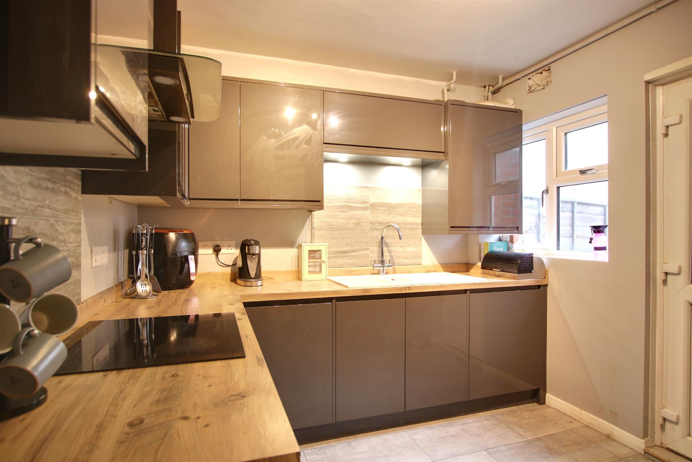 Laminate flooring. Wall and base units. Dishwasher, double electric oven and induction hob, one and half bowl sink with drainer. Door leading to reception room. Smooth ceiling. Double-glazed window to side aspect.