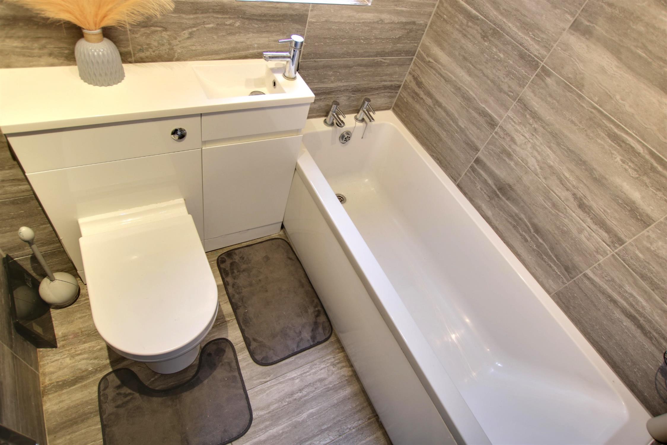 Tiled flooring and walls. Panel enclosed bath. Low level W.C and basin. Obscure double-glazed window to rear aspect. Smooth ceiling with spot lighting. Heated towel rail