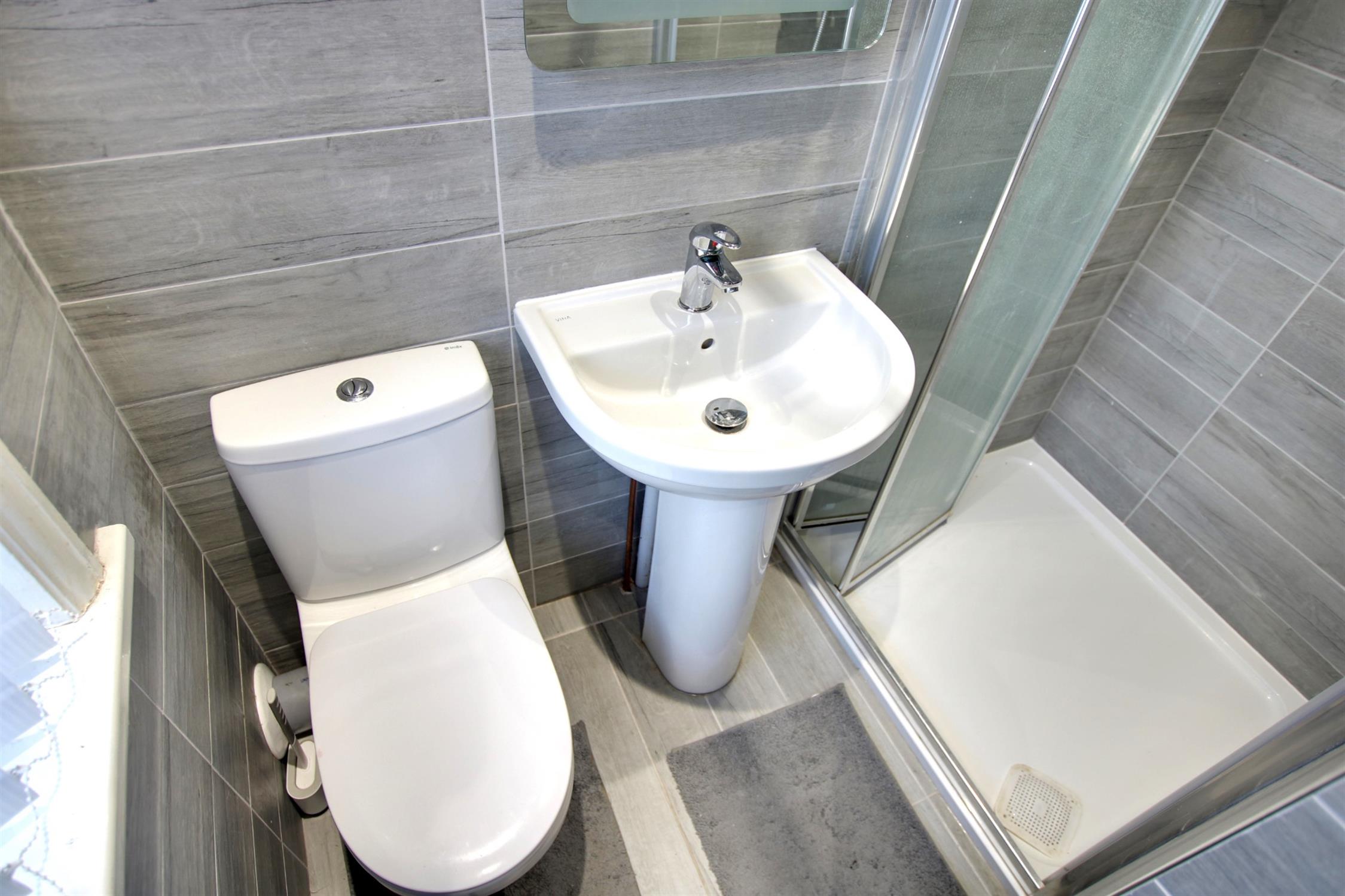 Tiled flooring and walls. Enclosed shower cubicle with tiled walls. Low level W.C and pedestal sink. Smooth ceiling with spot lighting. Double-glazed window to rear aspect.