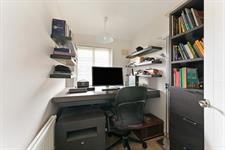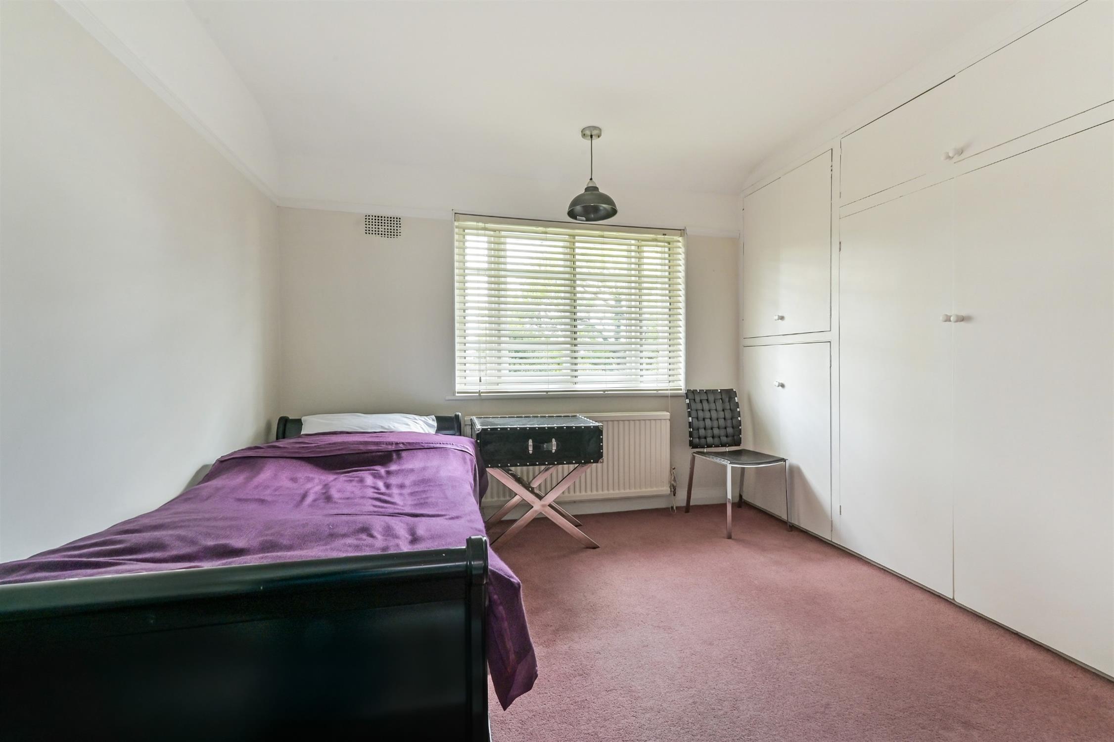 Window. Radiator. Smooth plastered ceiling. Picture railing. Fitted range of wardrobes providing useful hanging and shelf storage and also housing wall mounted central heating boiler.