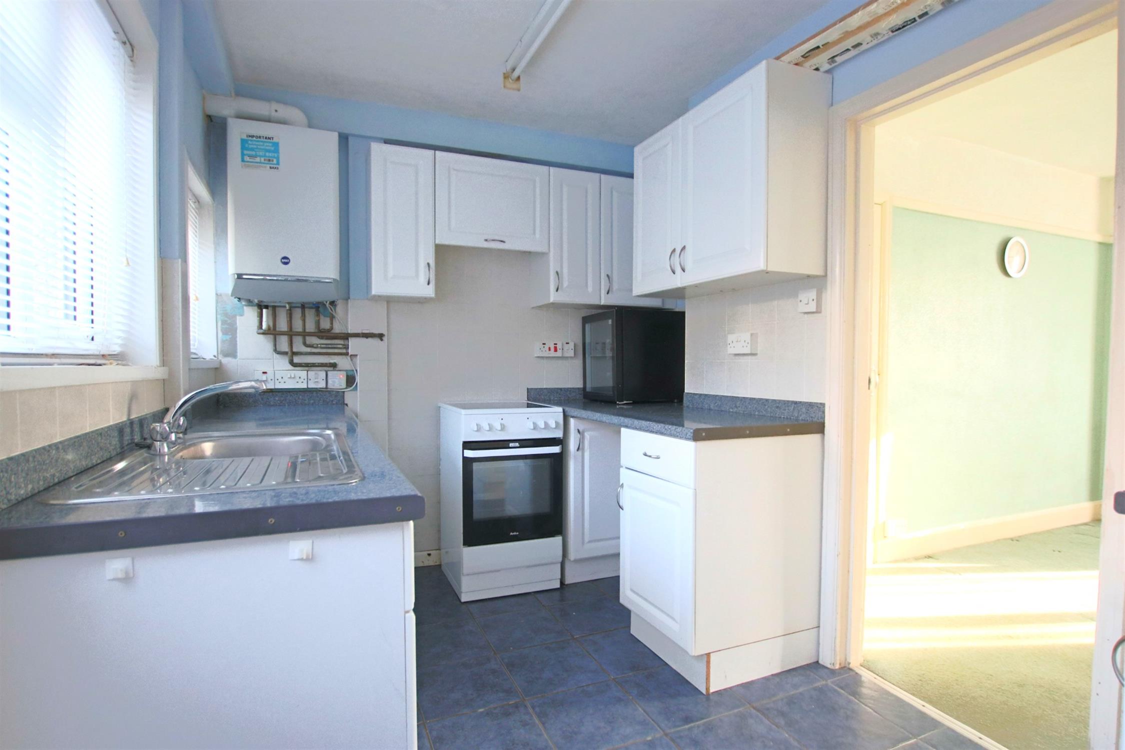 Tiled flooring and part-tiled walls. Fitted matching white gloss wall and base units with worktop over. Space for washing machine. Free-standing electric oven. One and half bowl sink with drainer. Door to the garden. Textured ceiling. Double-glazed window to rear aspect. Combination boiler.