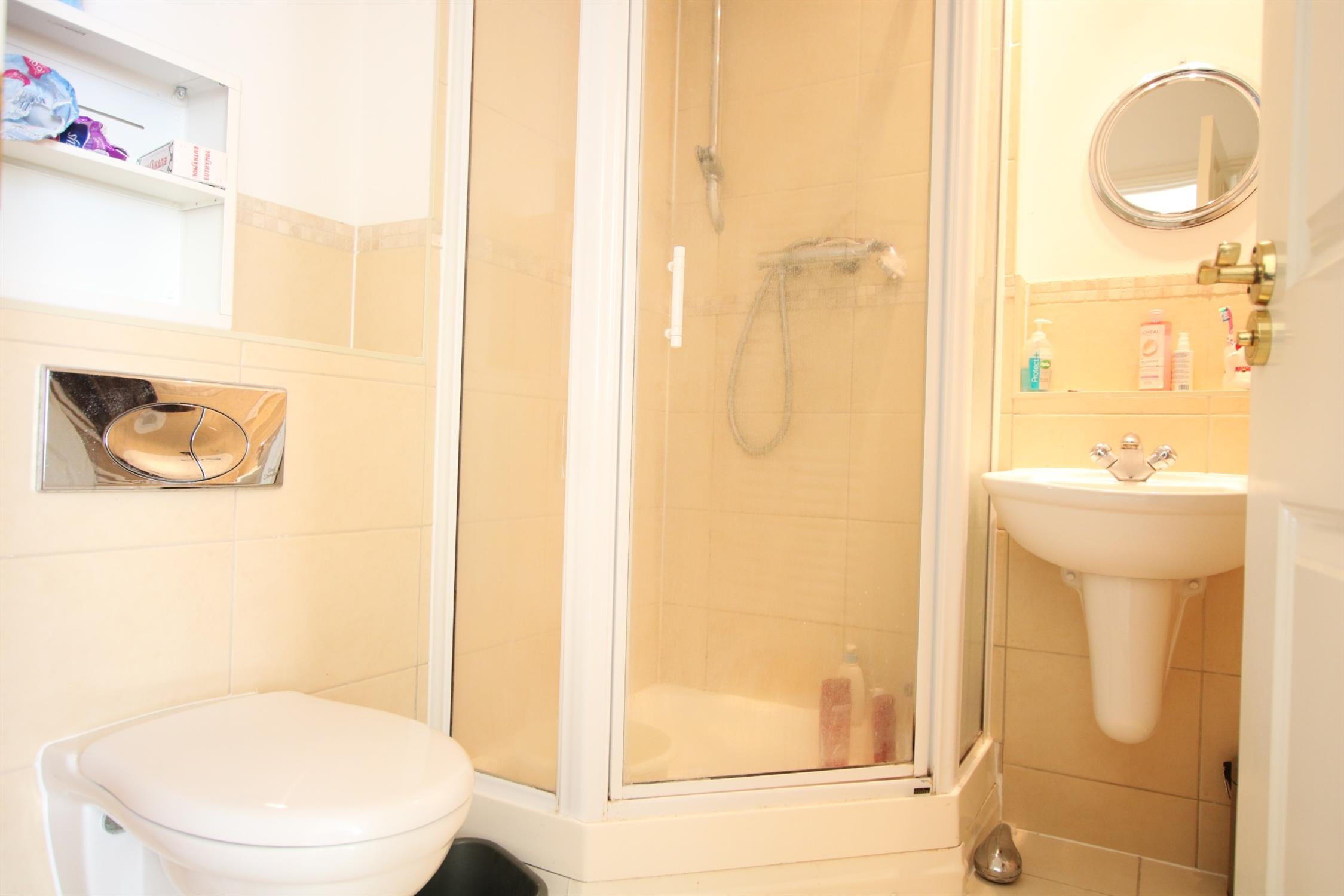 Tiled flooring and partially tiled walls. Corner shower cubicle, low level w.c. with hidden cistern and ceramic sink unit. Heated towel rail.