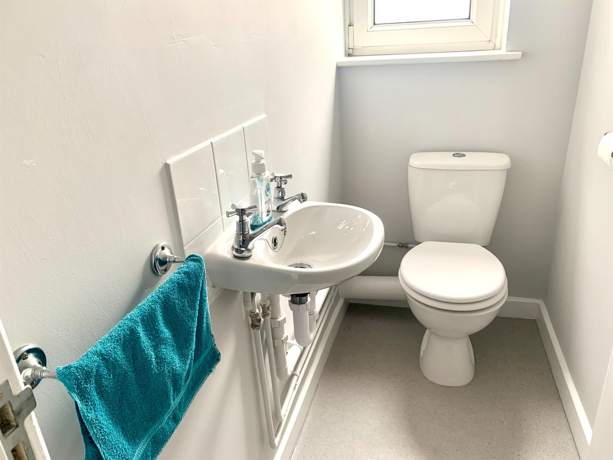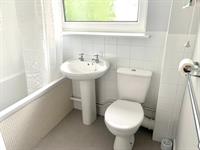 TOILET: White suite with toilet and sink and window to rear.